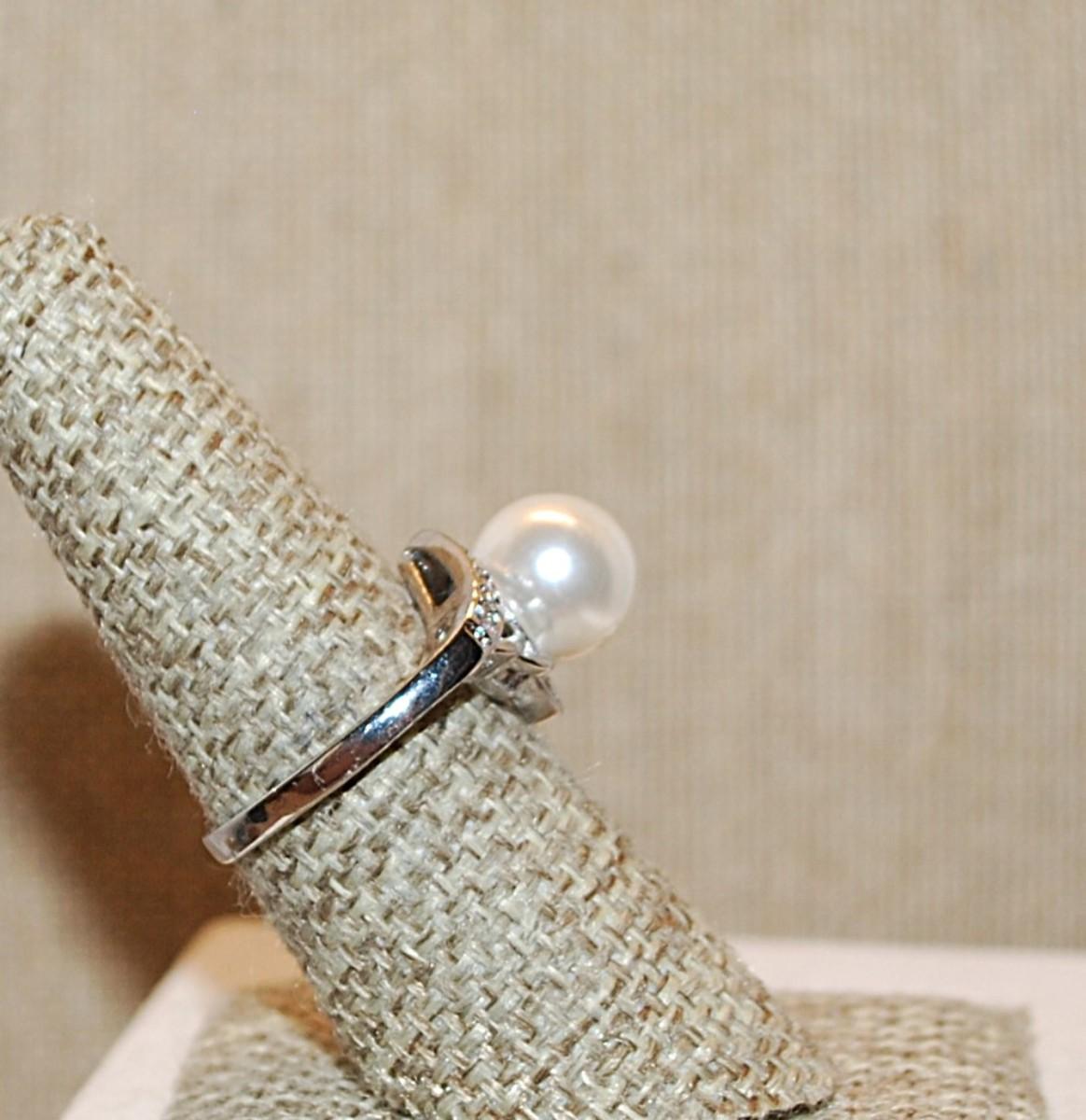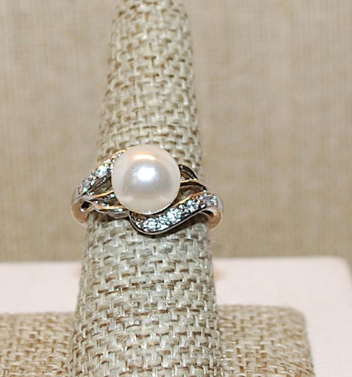 Size 7½ FAUX White PEARL Ring with Swirl Clear Stones Sides Ring on a Silver Tone Band (3.5g)