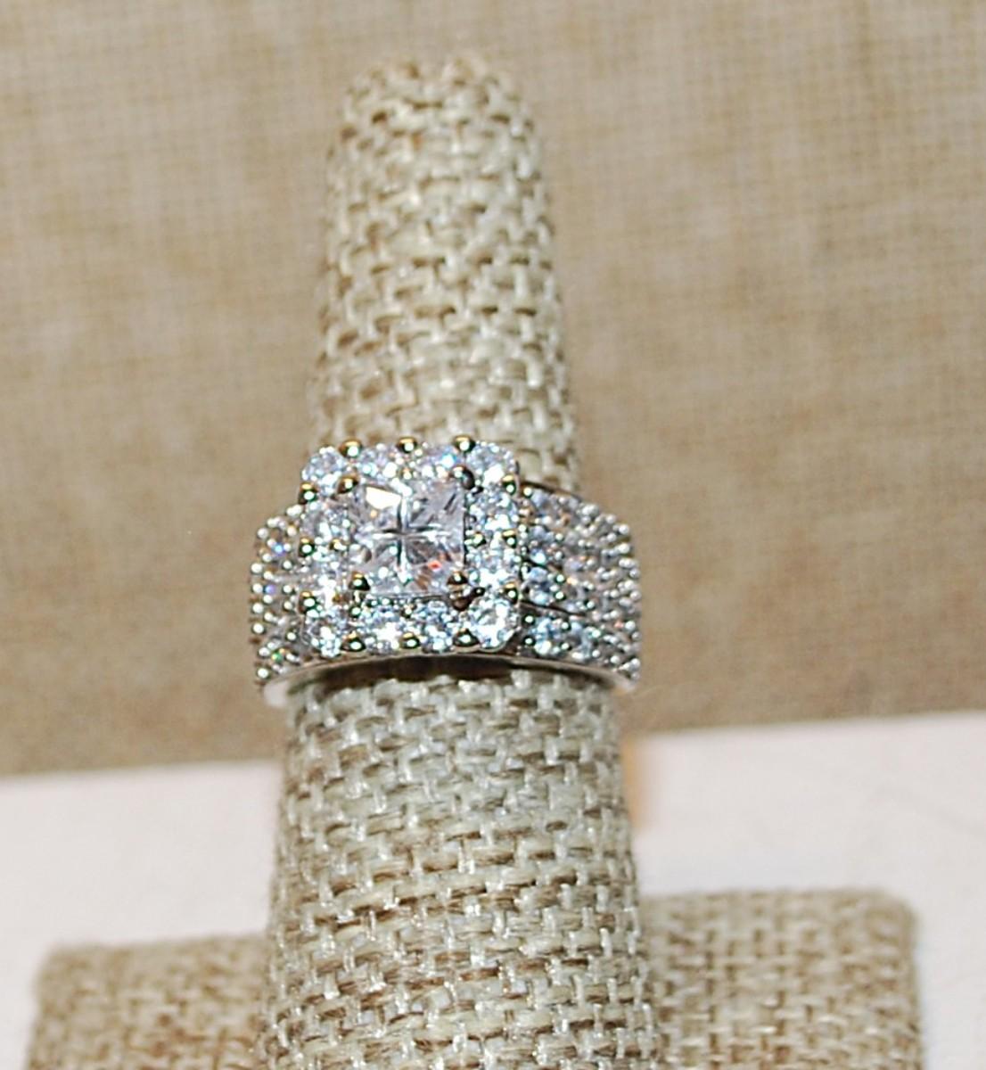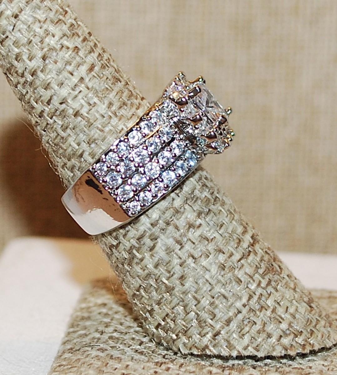 Size 7 Flashy Brilliant Shiny Party Ring with Square Main Stones and 4 Rows of Accent Stones on a Solid Silver Tone Band (8.8g)