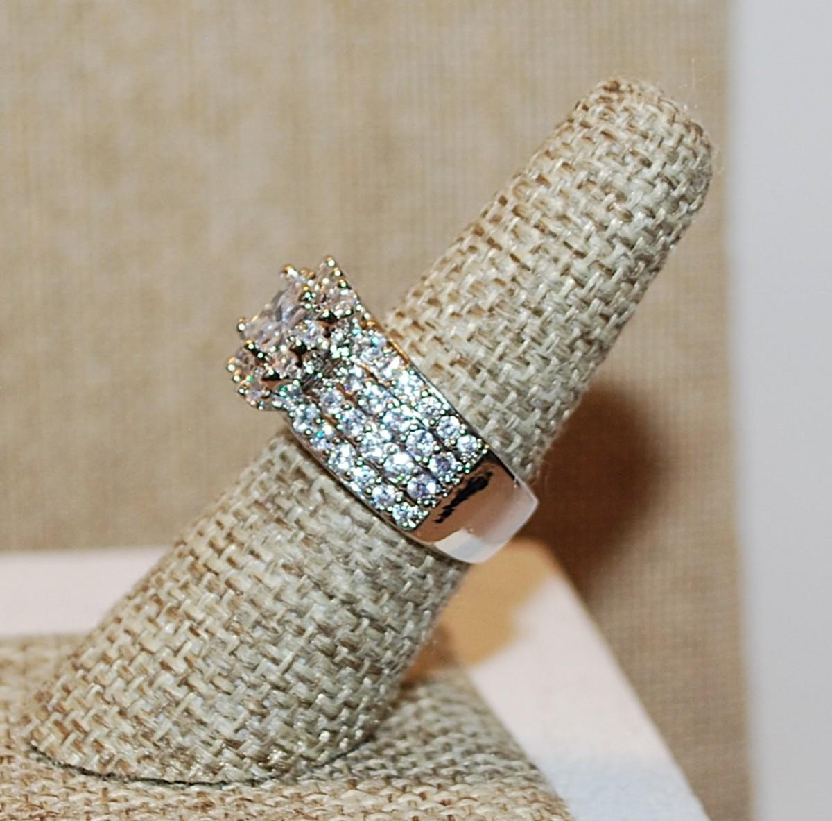 Size 7 Flashy Brilliant Shiny Party Ring with Square Main Stones and 4 Rows of Accent Stones on a Solid Silver Tone Band (8.8g)