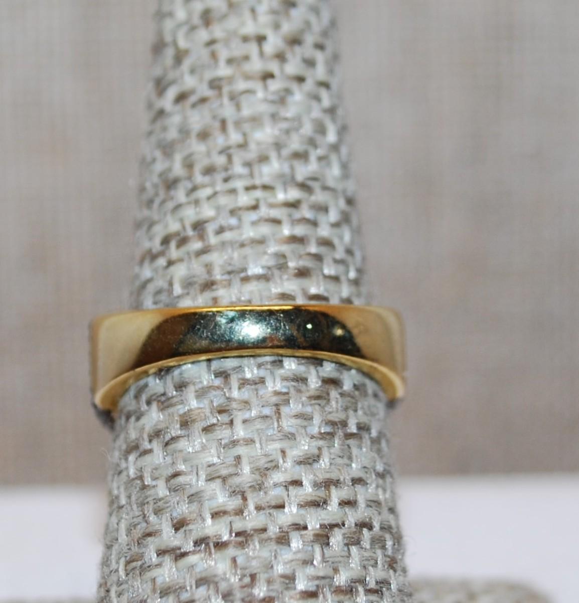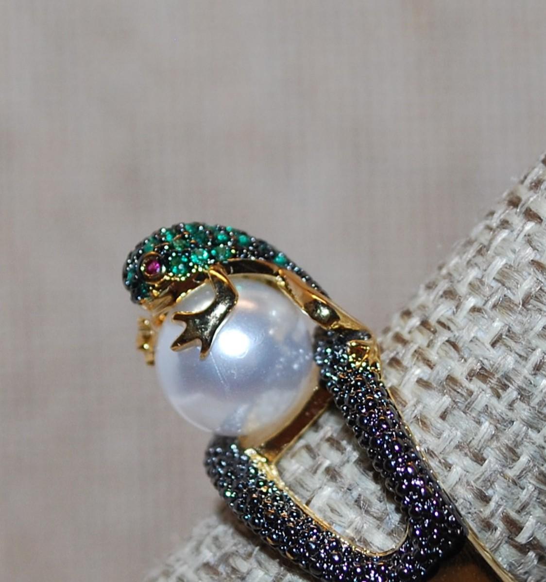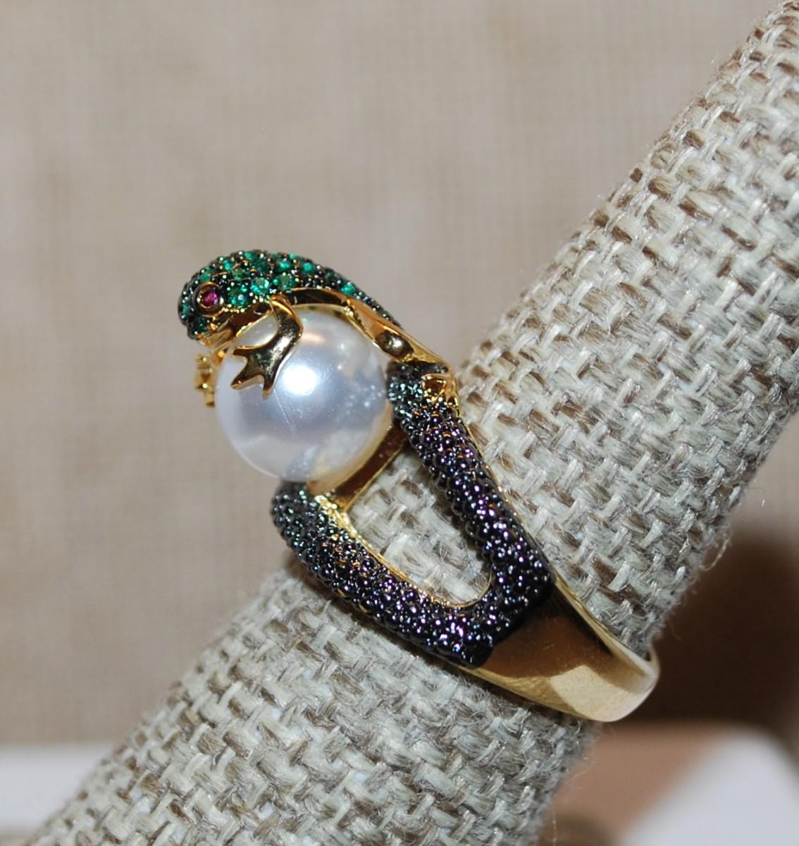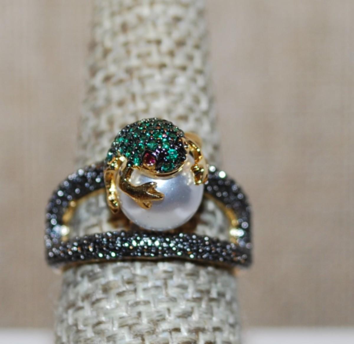 Size 7 "GREEN FROG on a PEARL" Ring on a Gold Tone Band (5.6g)