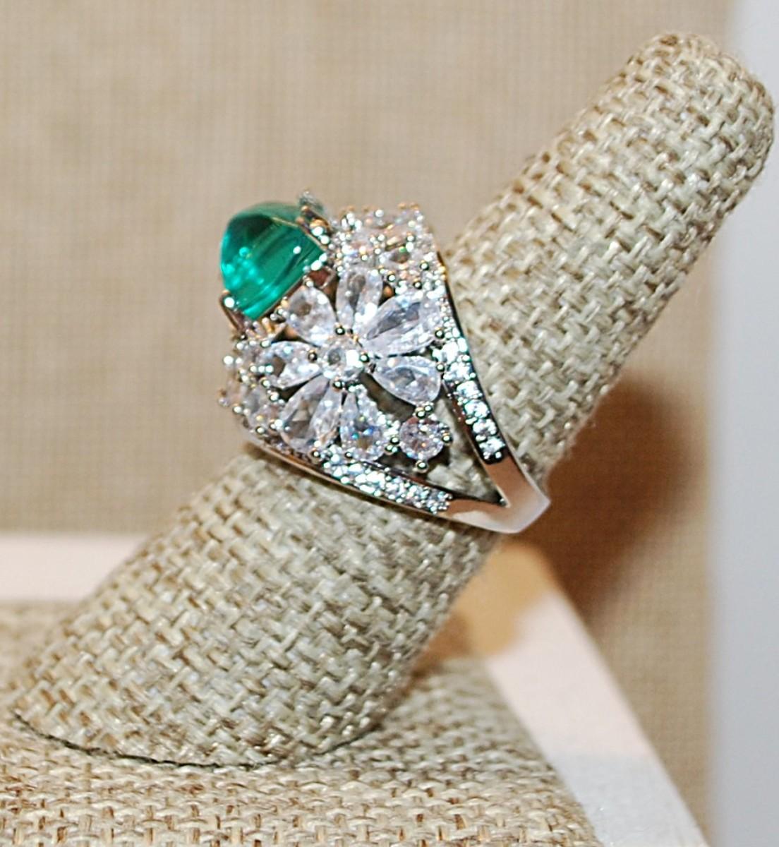 Size 7½ GREEN Pyramid Main Stone Party Ring with Side Petal Flowers on a Silver Tone Band (9.7g)