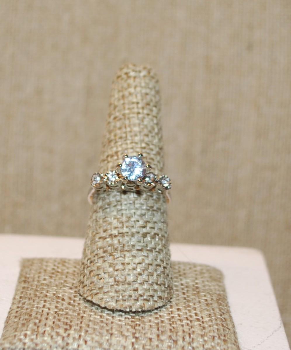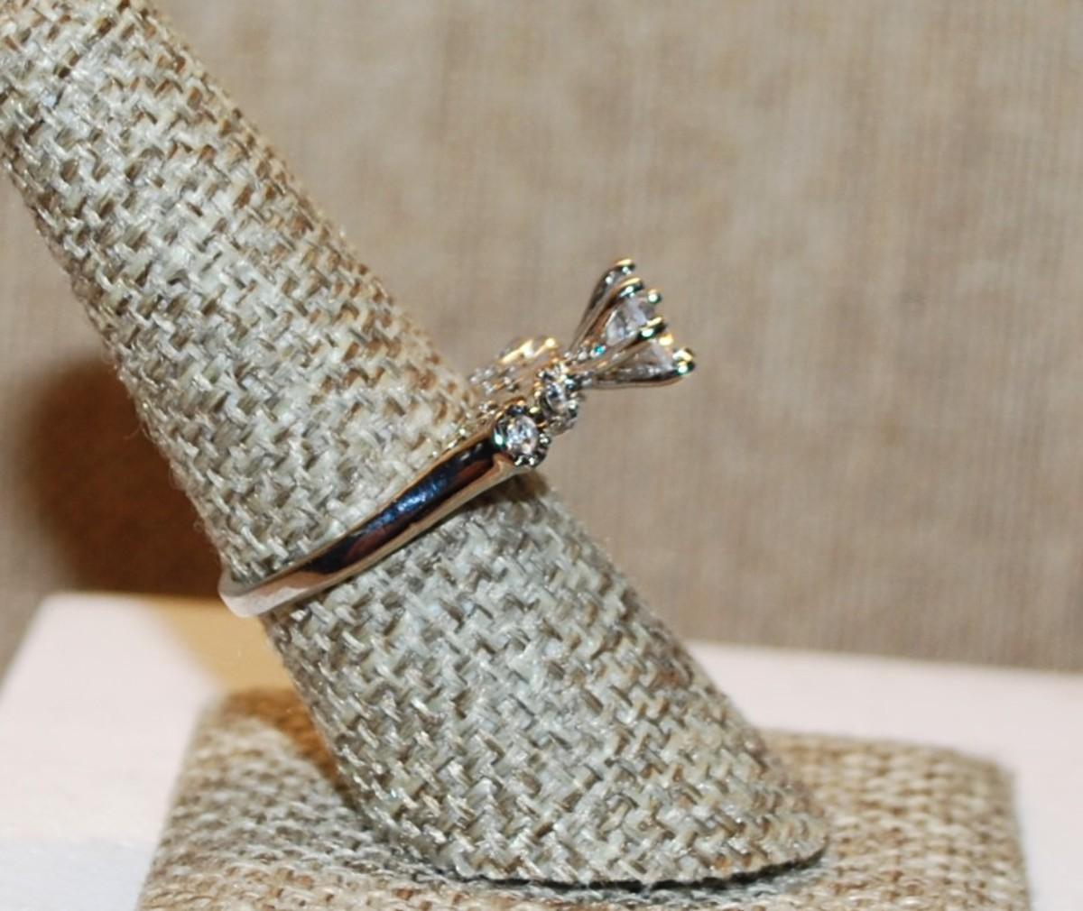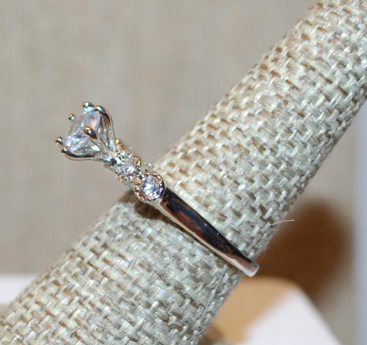 Size 7½ "High Rise" Style Wedding/Engagement Ring with 4 Clear Stone Side Accents on a Silver Tone Band (2.8g)