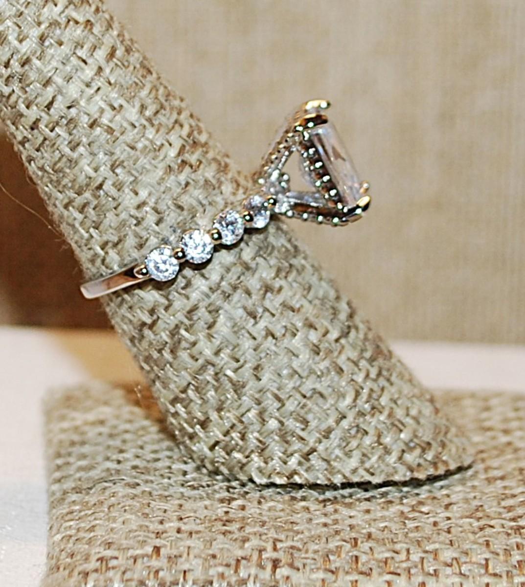Size 7½ Hi-Rise Clear Rectangle Stone Ring with 10 Side Accent Stones on a Silver Tone Band (3.9g)