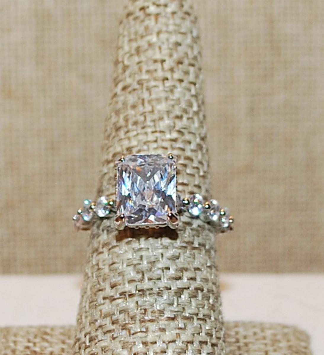 Size 7½ Hi-Rise Clear Rectangle Stone Ring with 10 Side Accent Stones on a Silver Tone Band (3.9g)