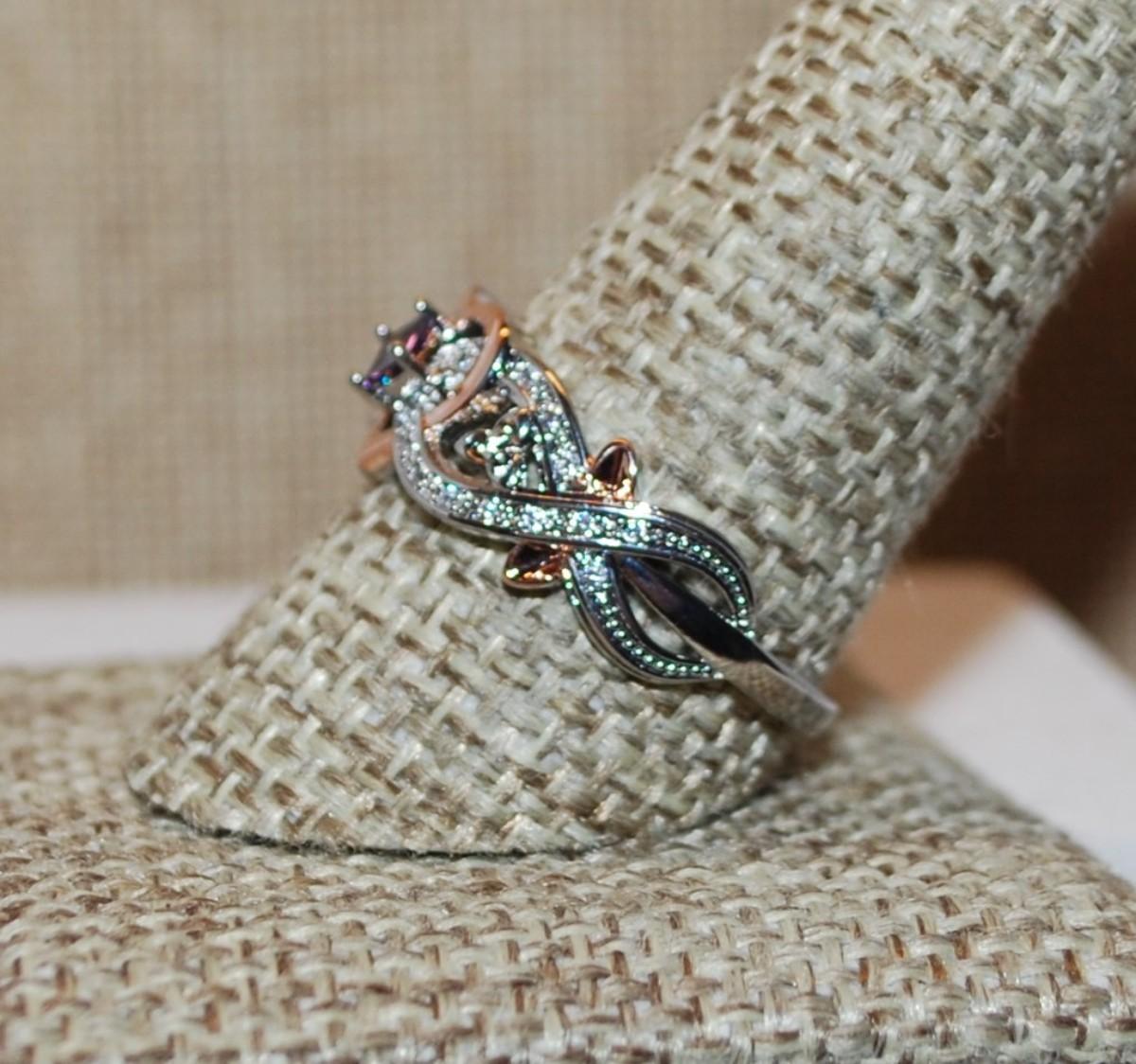 Size 7 ½ Intertwined 2-Tone HEART & SWIRLS Ring with a Tiny Purple Stone on a Silver Tone Band (3.2g)