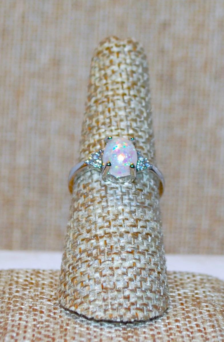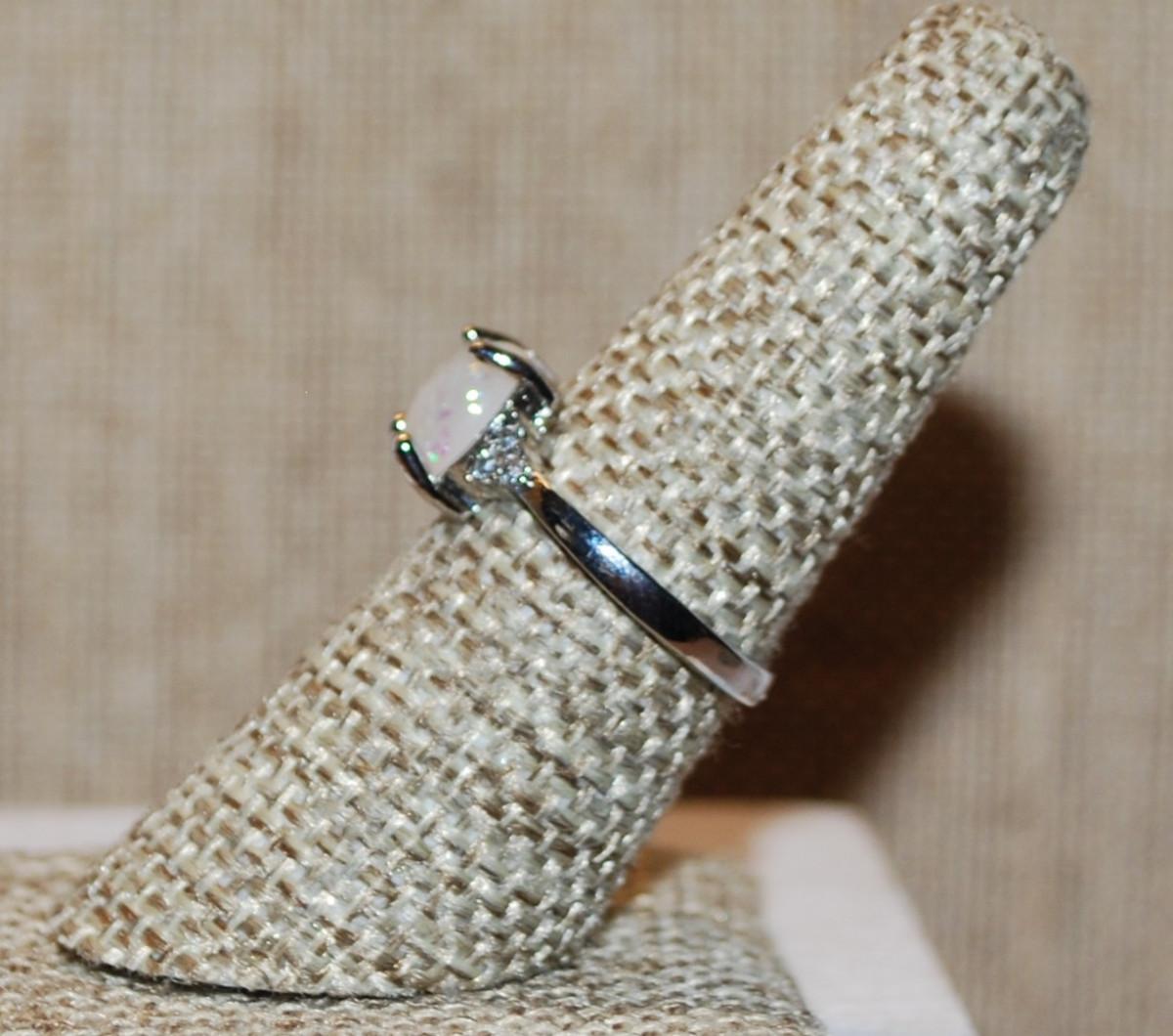 Size 7¼ Iridescent Opal-Style Stone Ring with 3 Clear Stones Side Accents on a Gold Tone Band (2.8g)