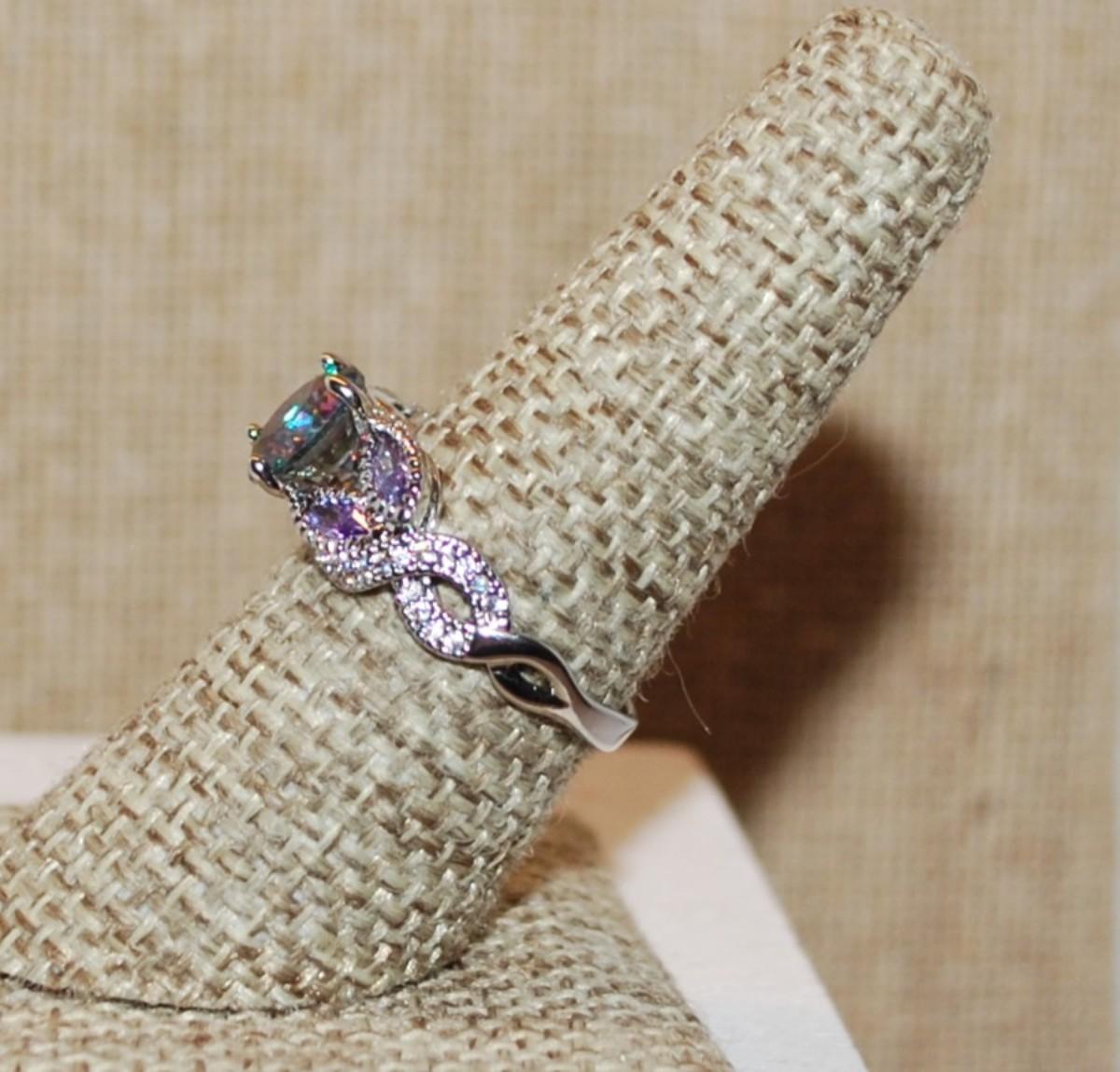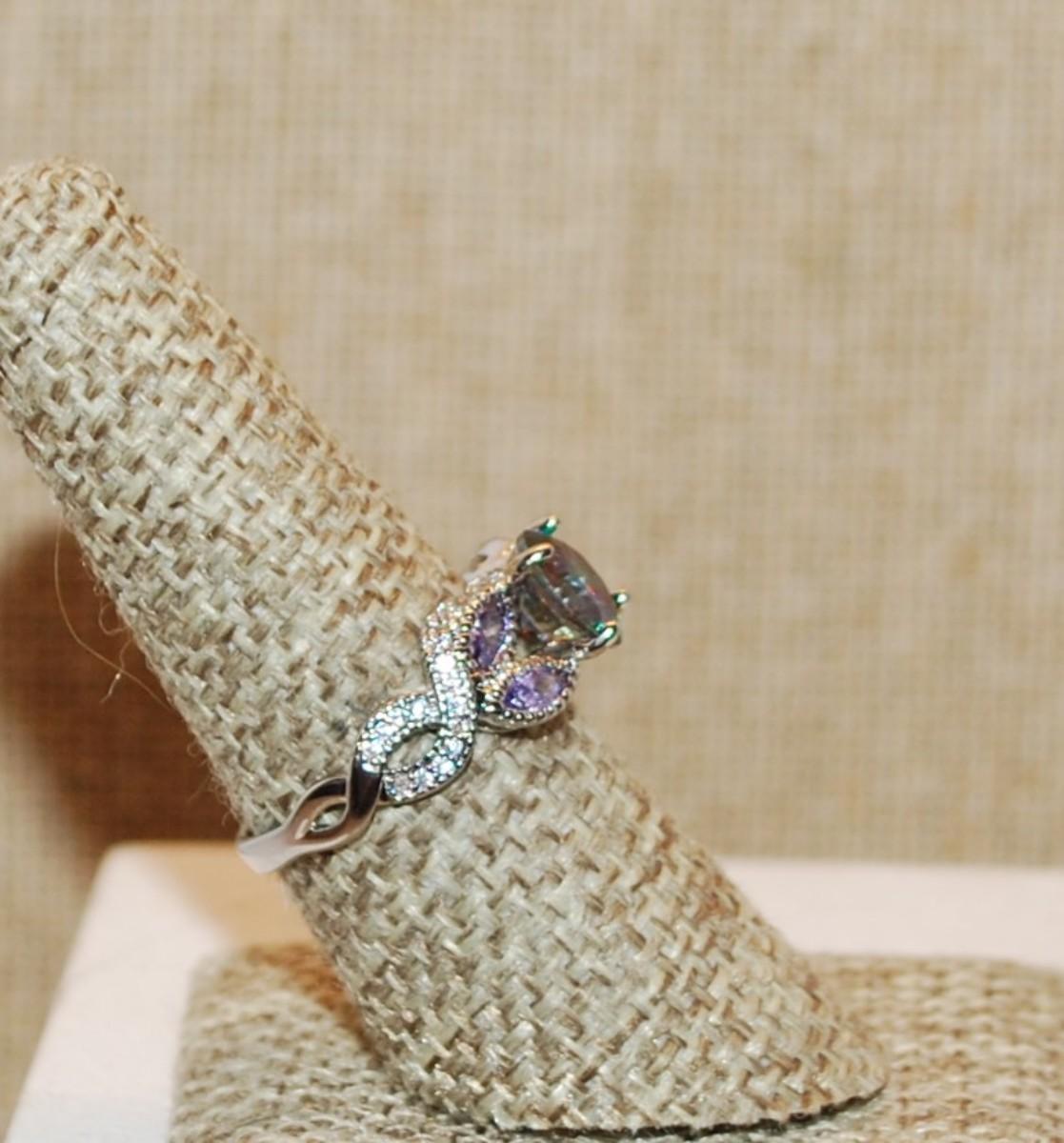 Size 7 ½ Iridescent Round Main 4 Prong Stone Ring with 4 "Leaves" of Light Purple Accent Stones on a Silver Tone Band (2.9g)