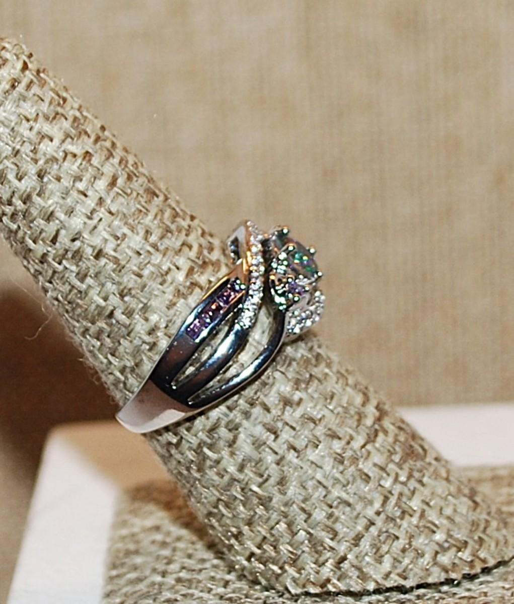 Size 7 ½ Iridescent Round Stone Ring with Swirl Accents on a Split Silver Tone Band (4.3g)