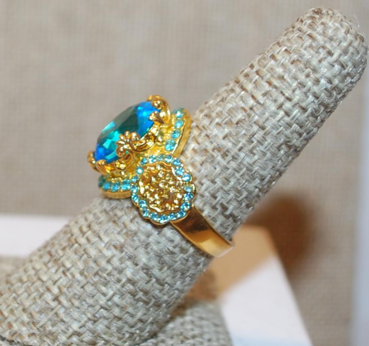 Size 7¼ Large Blue Transparent Stone Ring with Blue Side Accents on a Gold Tone Band (5.4g)