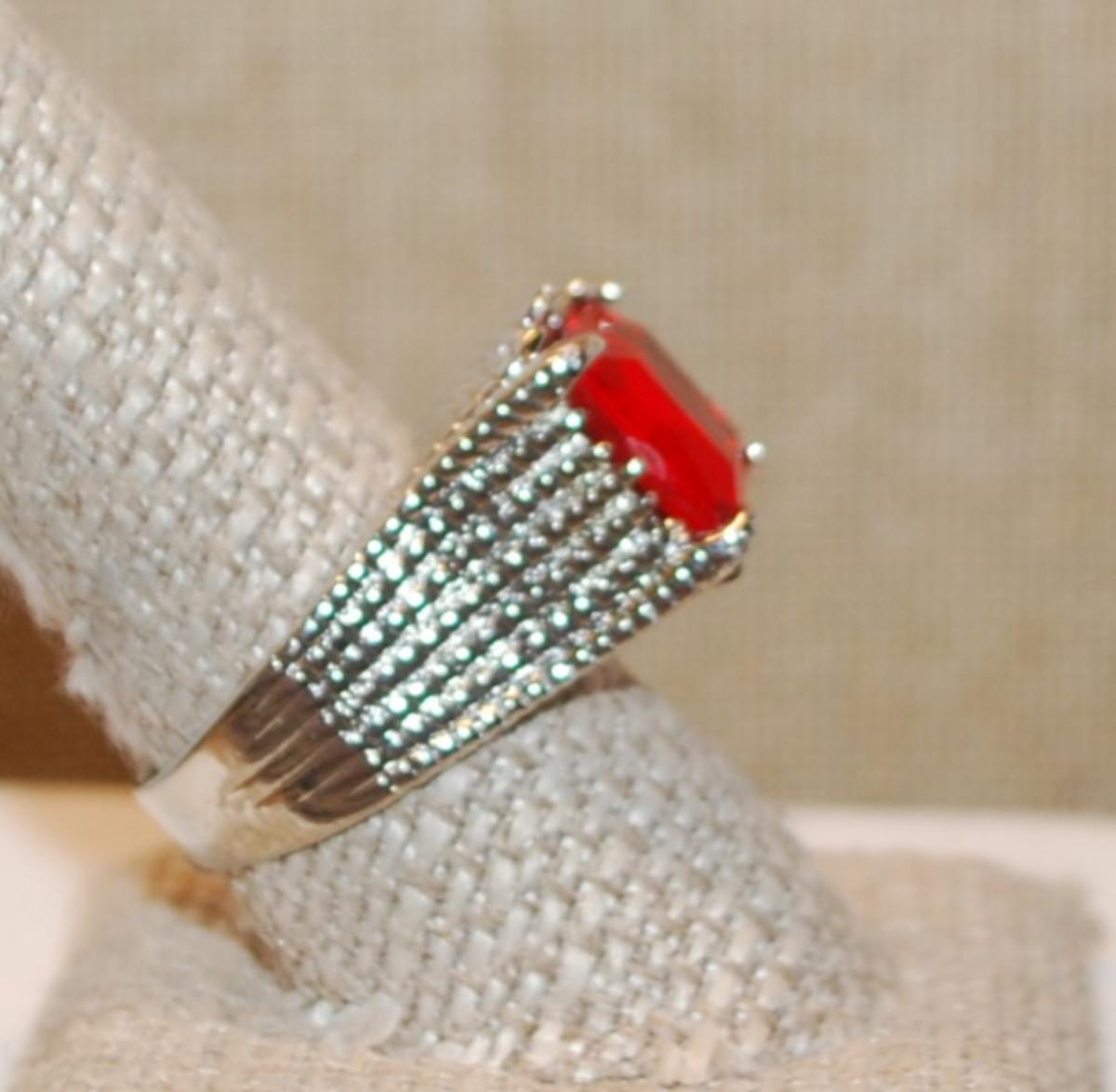 Size 7½ Large Bright Red Square Stone Party Ring on a Solid Silver Tone Band (10.3g)