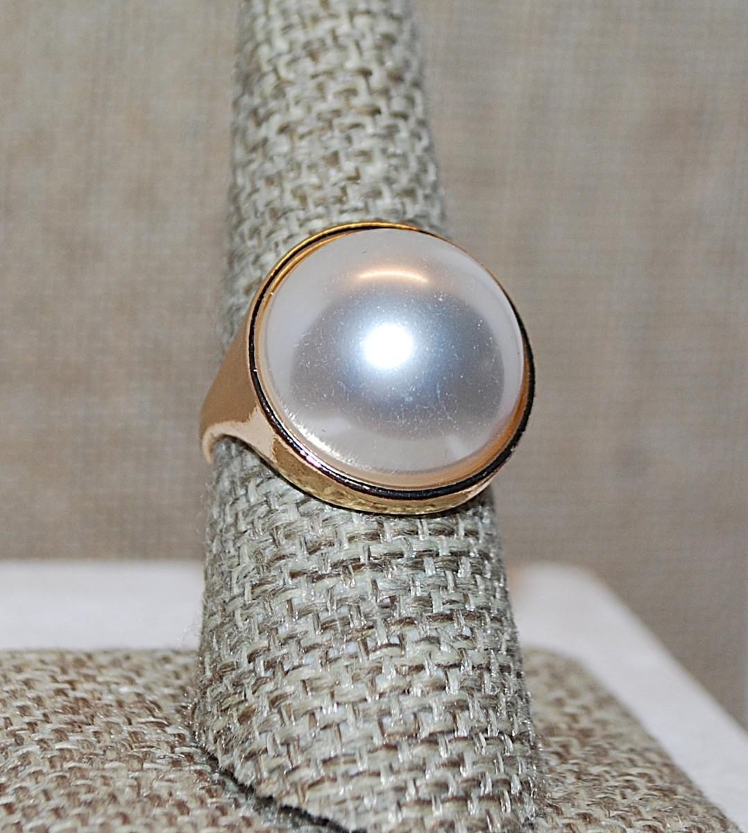 Size 7¾ Large Button Style "Pearl" RING with Cup Surround and Gold Tone Setting (8.0g)