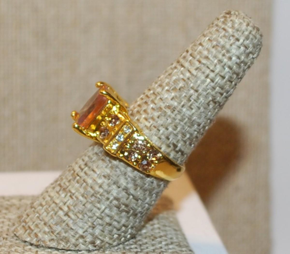 Size 7½ Large Champagne Colored 4 Prong Stone Ring with Accents on a Gold Tone Band (6.2g)