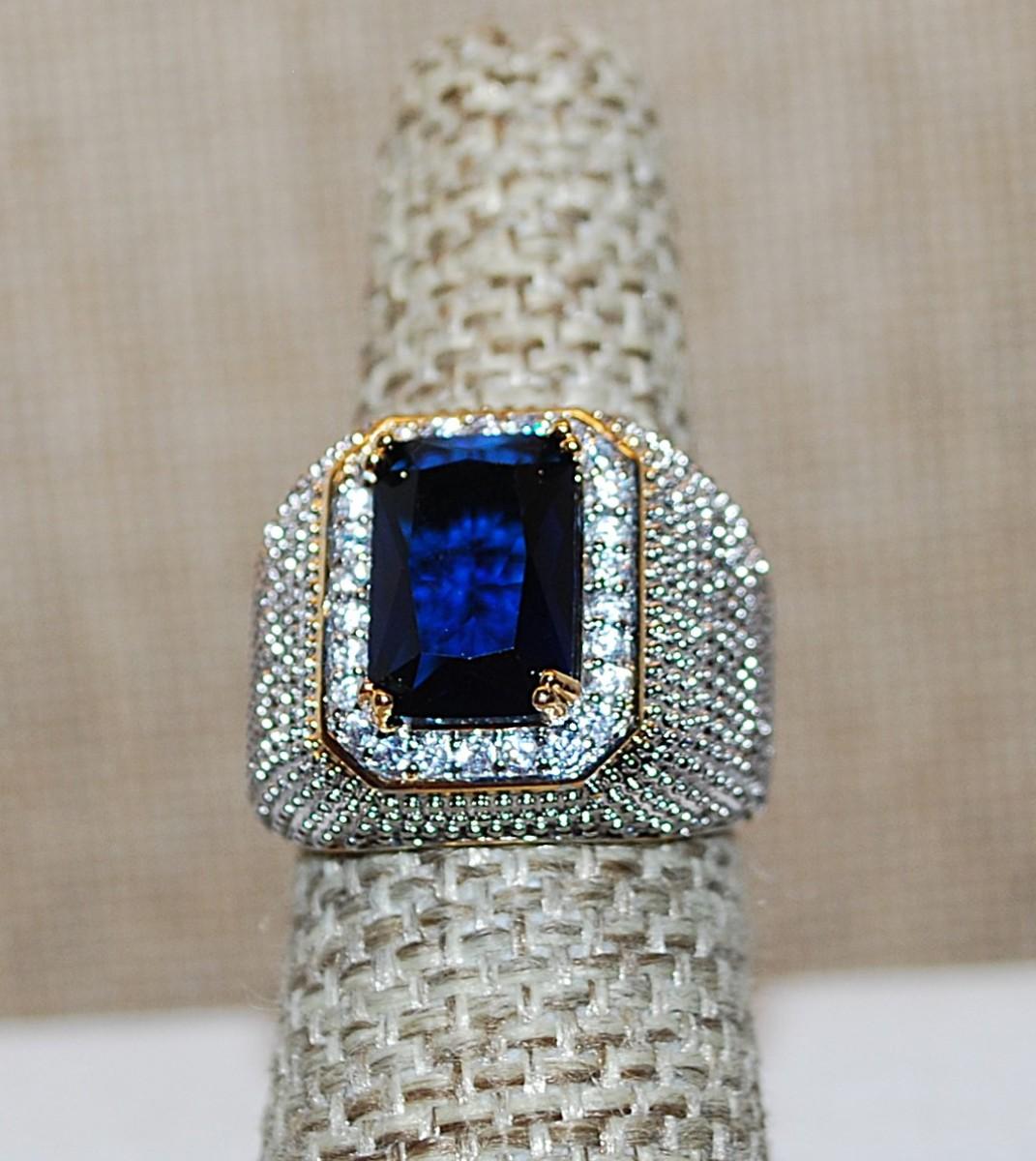 Size 7 Large Deep BLUE Rectangle Stone Party Ring with Stone Side Accents and Indented "Panels" on a Solid Gold Tone Band (8.2g)