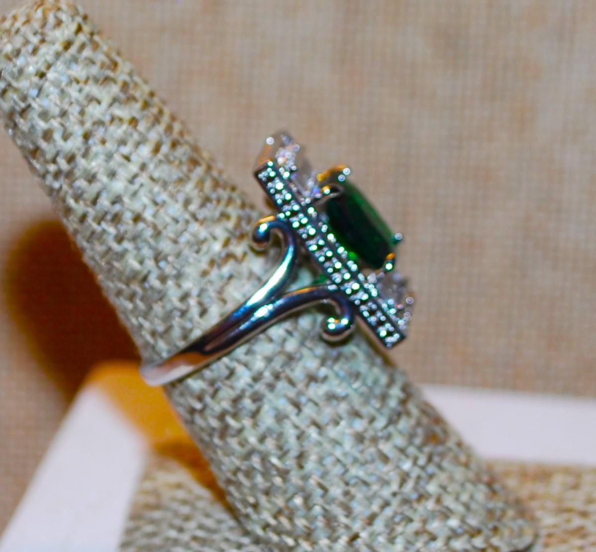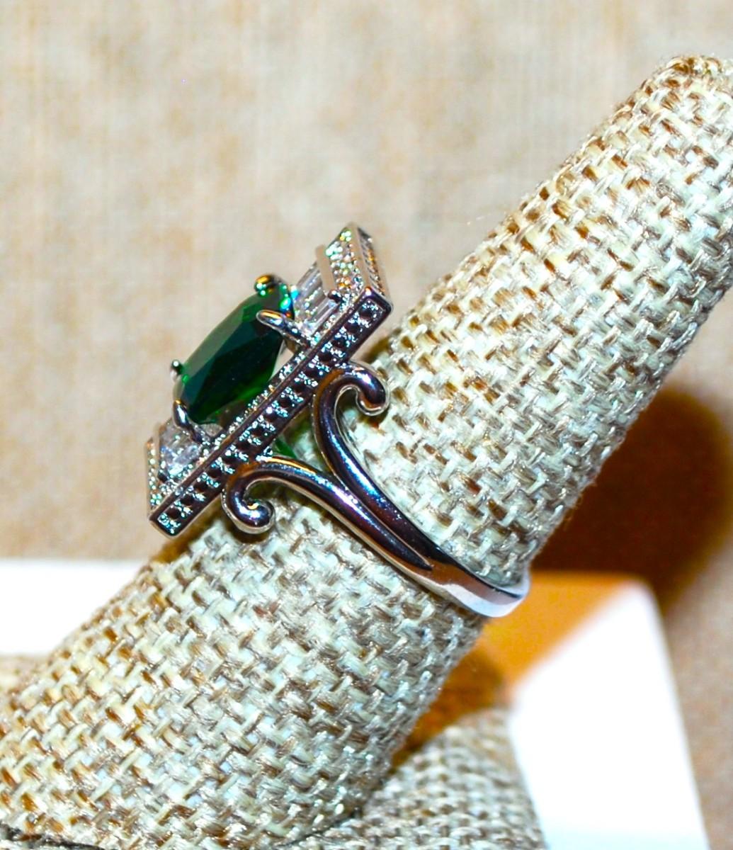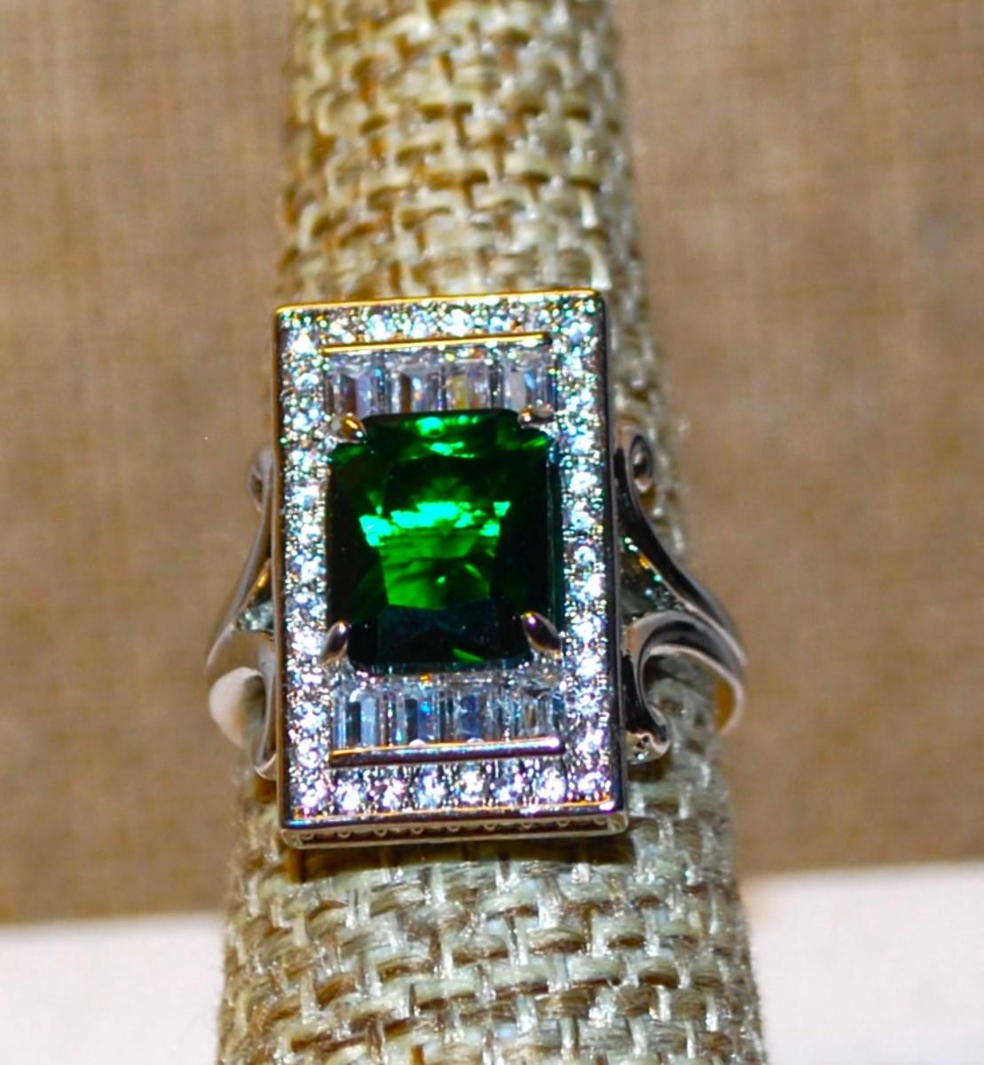 Size 7 Large Green Rectangle Main Stone Party Ring on a Glitter "Platform" and Silver Tone Band (5.3g)