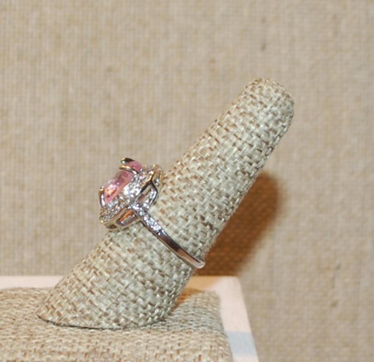 Size 7½ Large Oval Pink Stone Ring with Full Surround on a Nest Setting & Silver Tone Band (4.1g)