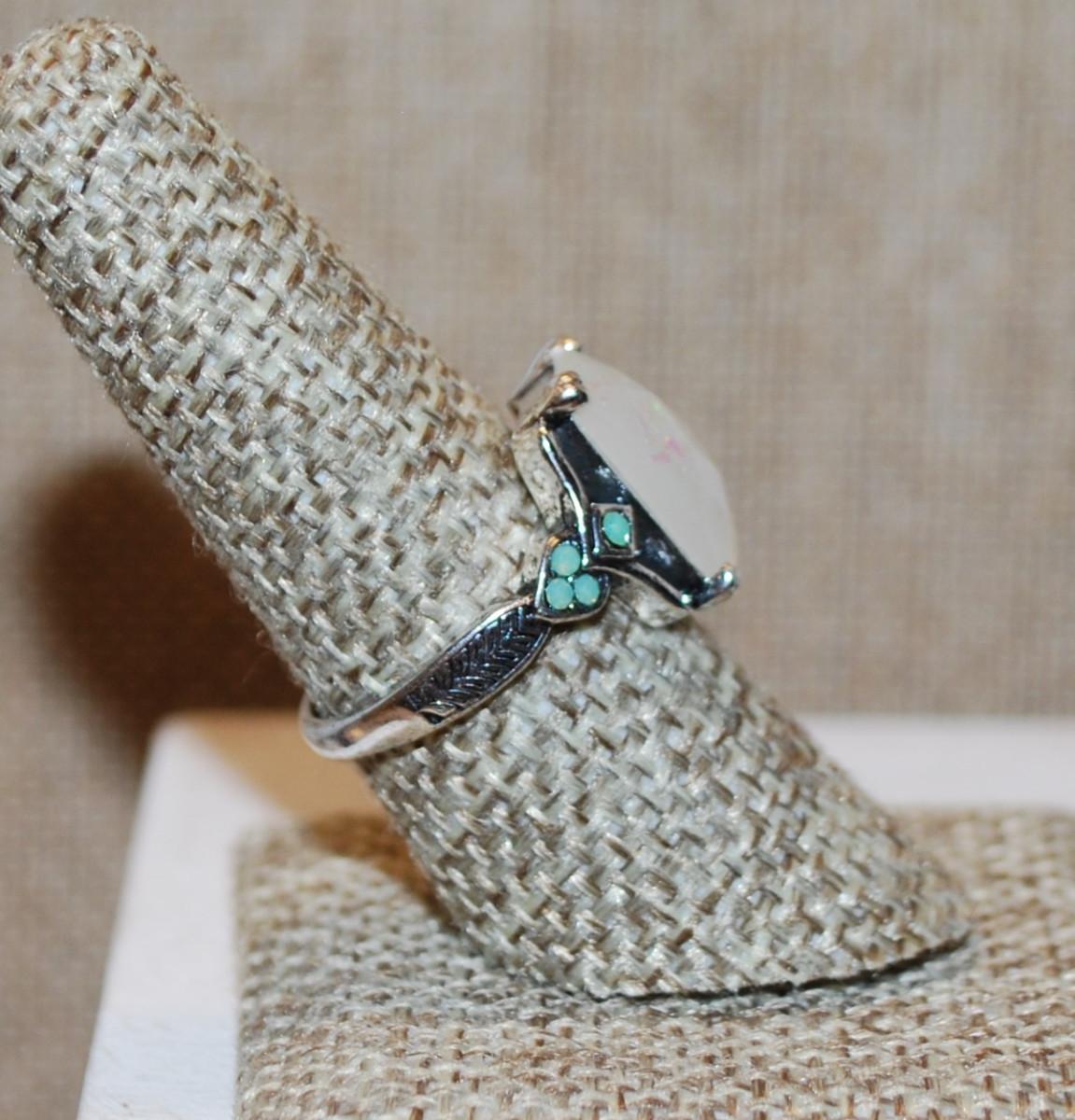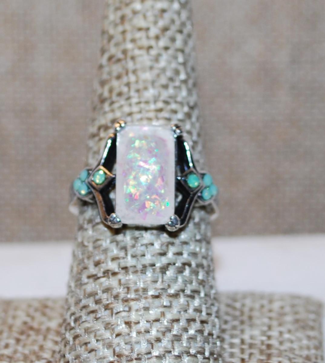 Size 7¼ Large Rectangular Iridescent Center Stone with Aqua Blue Tiny Stone Side Accents on a Silver Tone Band (3.9g