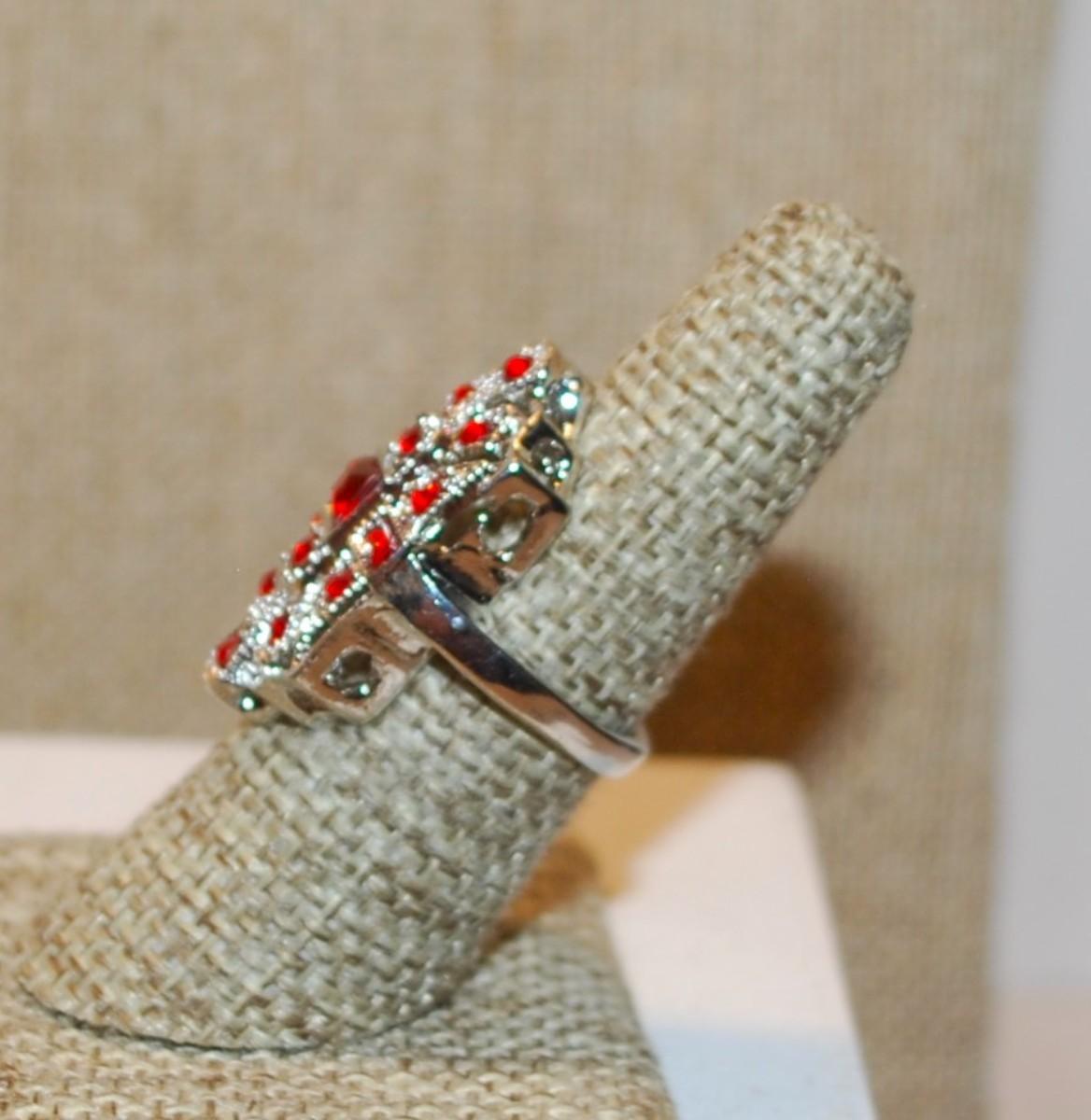 Size 7 Large Red & Silver Cocktail Style Ring on a Solid Silver Tone Band (7.3g)