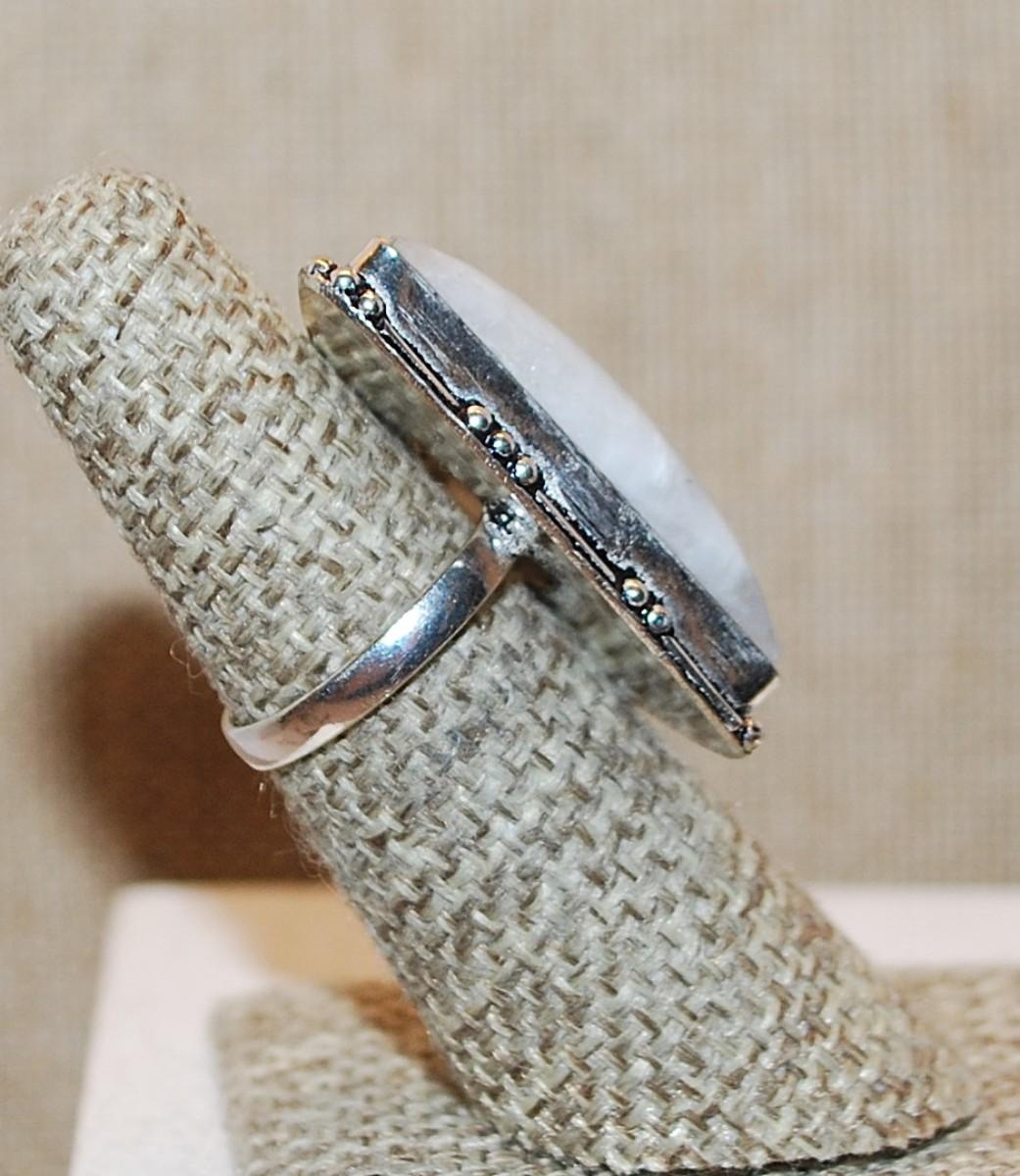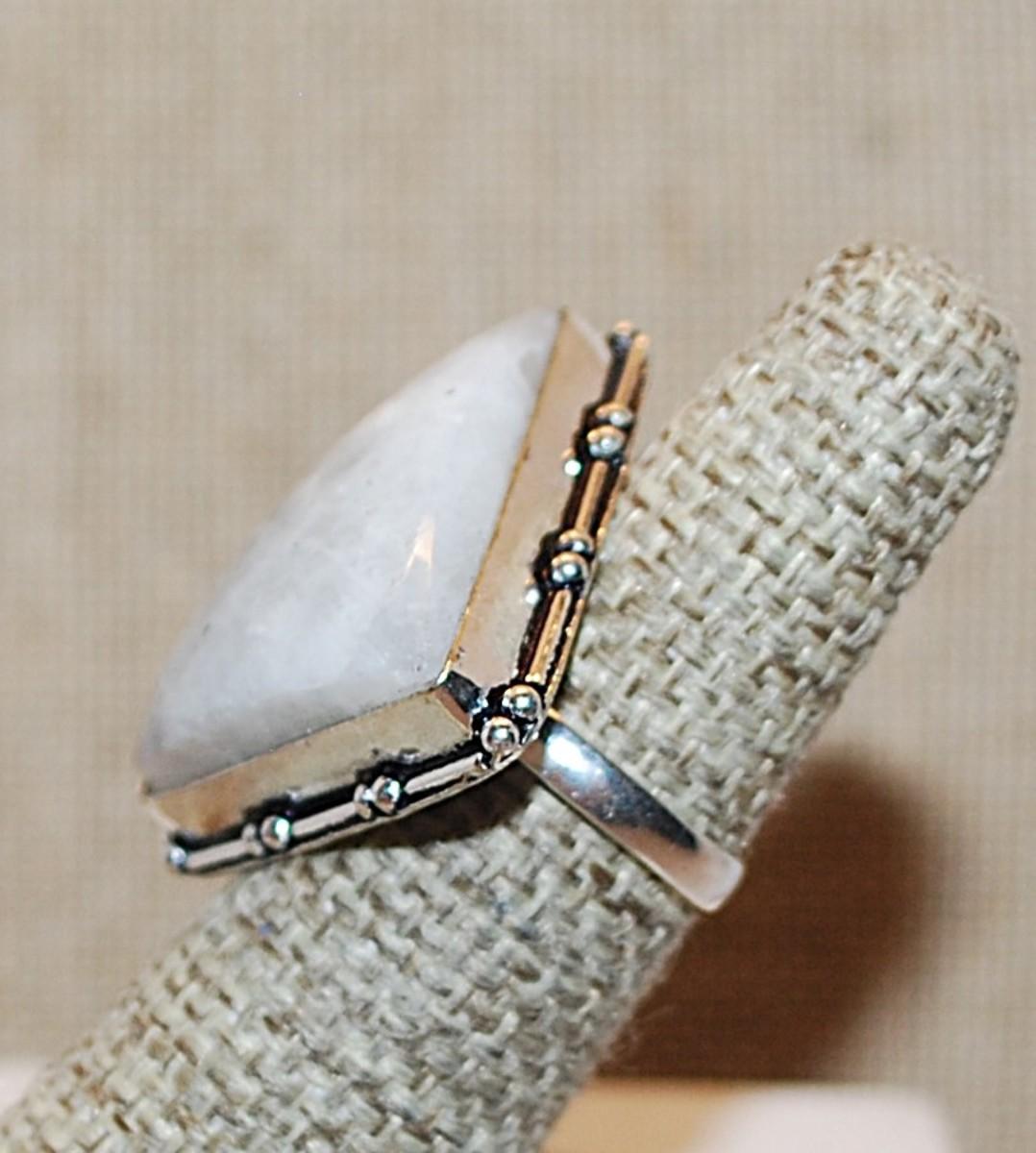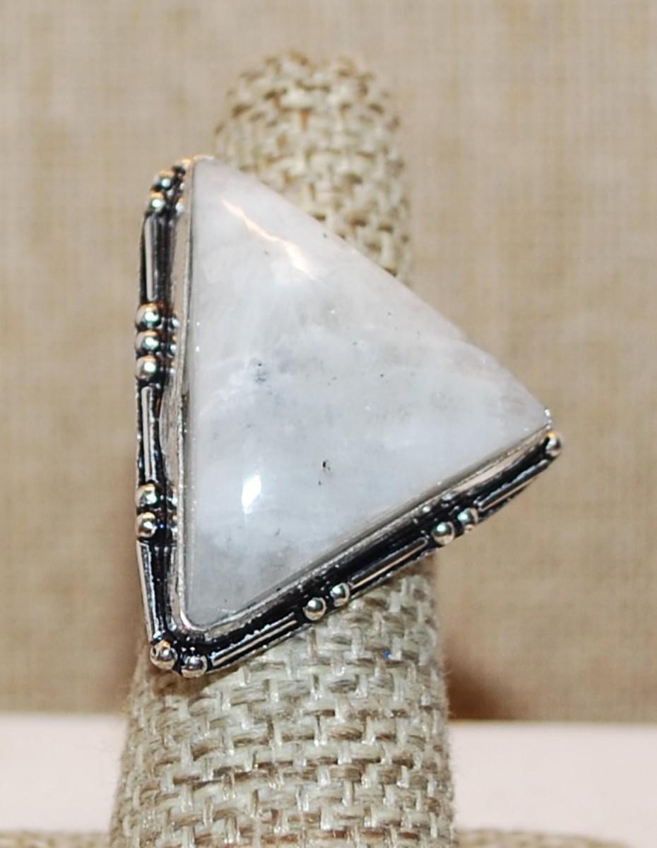Size 7 Large Triangle Shaped Opaque WHITES & GRAYS Colored AGATE Gemstone with Line/Globes Surround on a Silver Tone Band (10.5g)