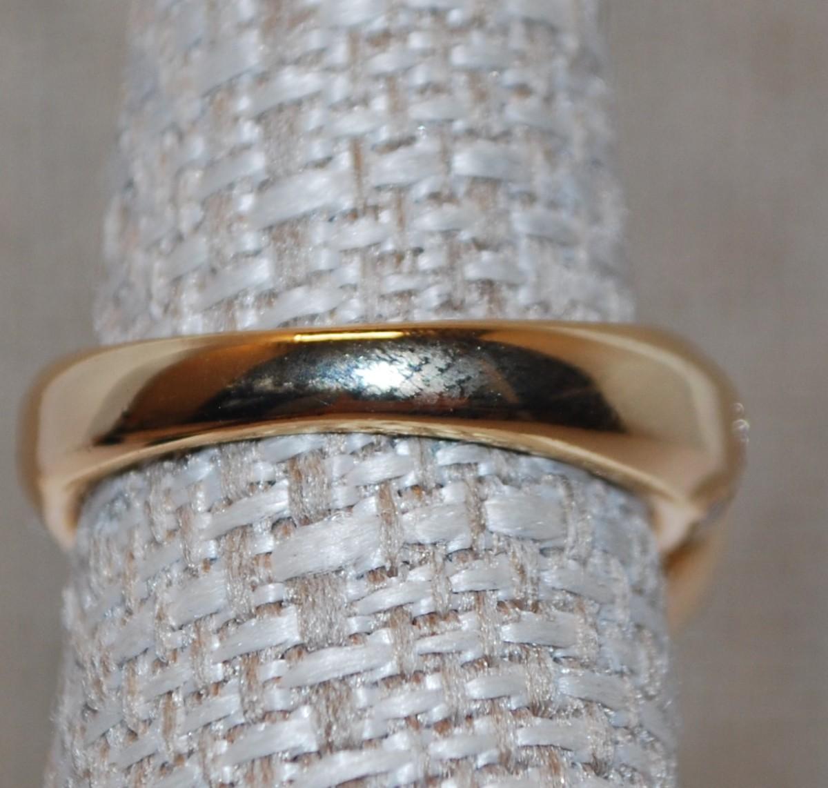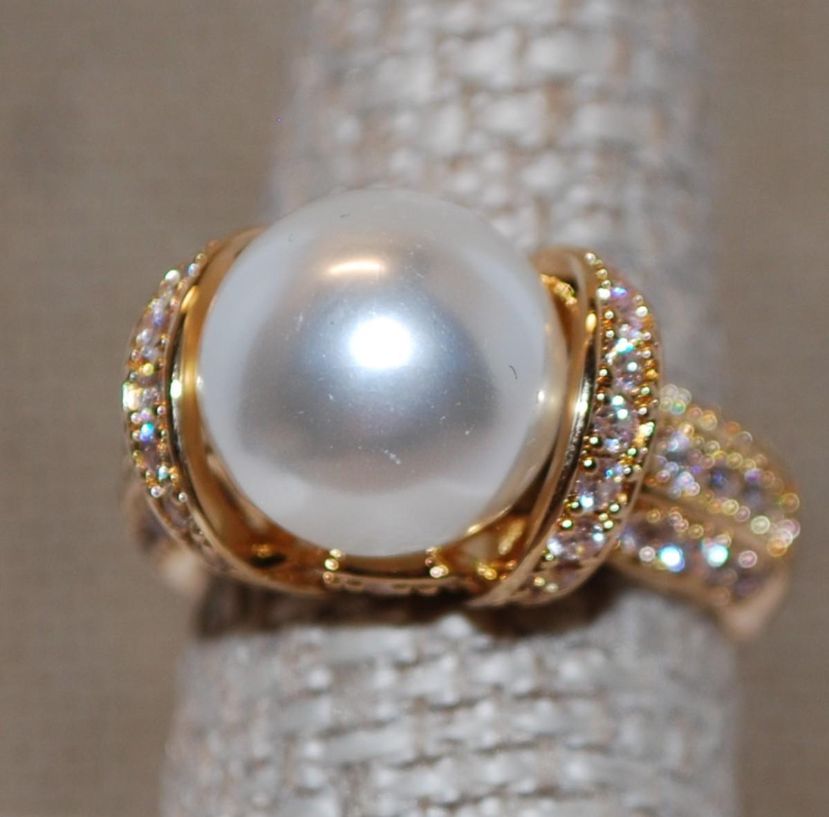 Size 7½ Large White Pearl with 2 Sparkle Side Rings and Accent Stones on a Gold Tone Band (6.9g)