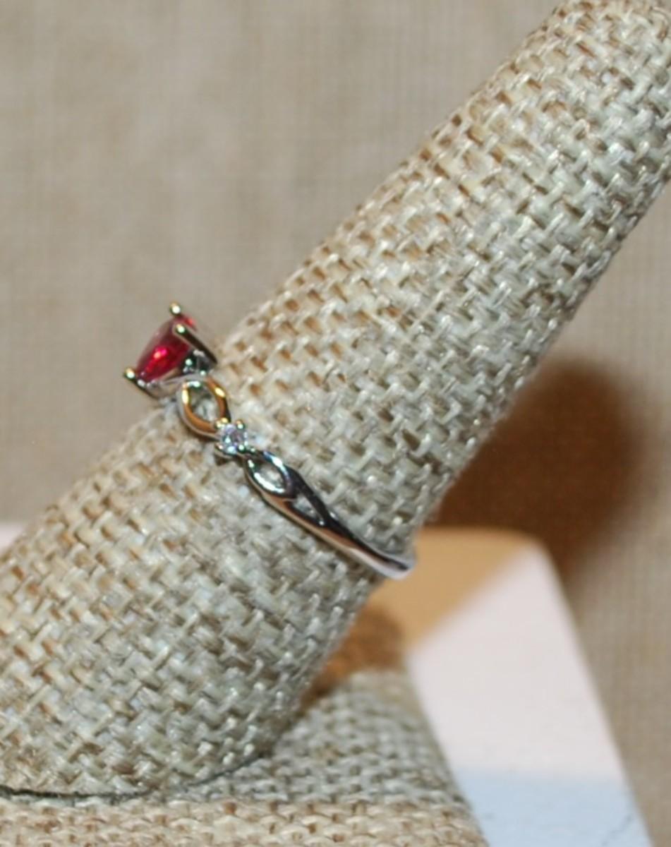 Size 7½ Light Colored Red HEART Ring with 2 Stone Side Accents on a Silver Tone Band (1.5g)