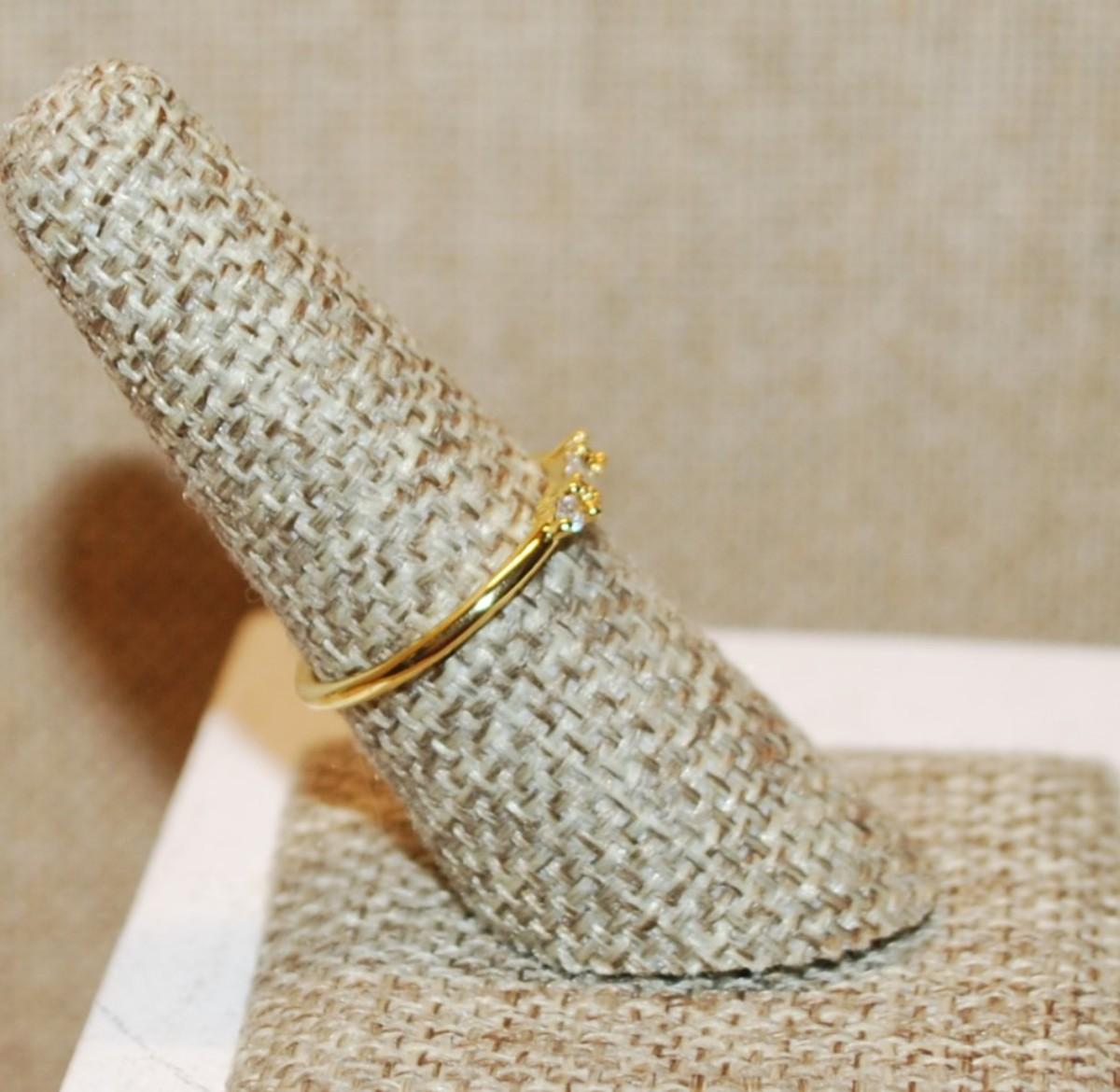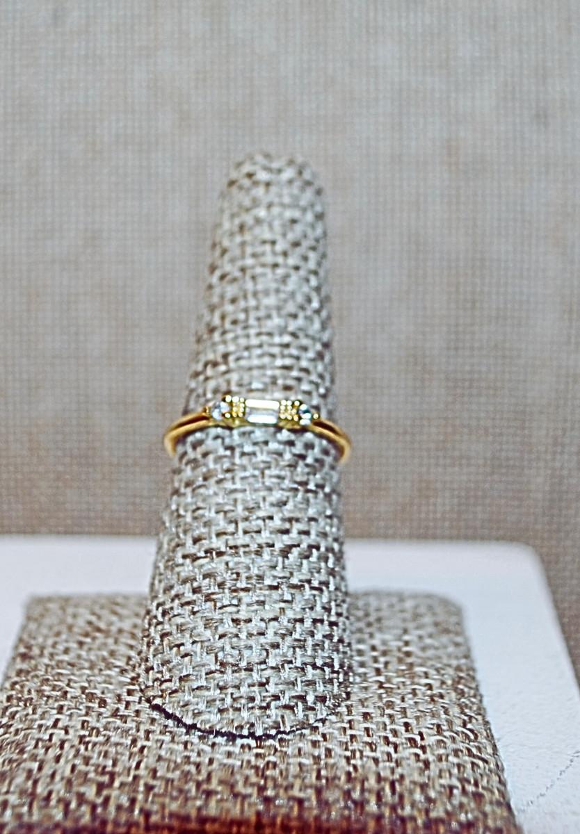 Size 7¼ Marked .925 Delicate CLEAR Rectangle Stone Ring with 2 Side Round Accent Stone on Gold Colored Band (1.2g)