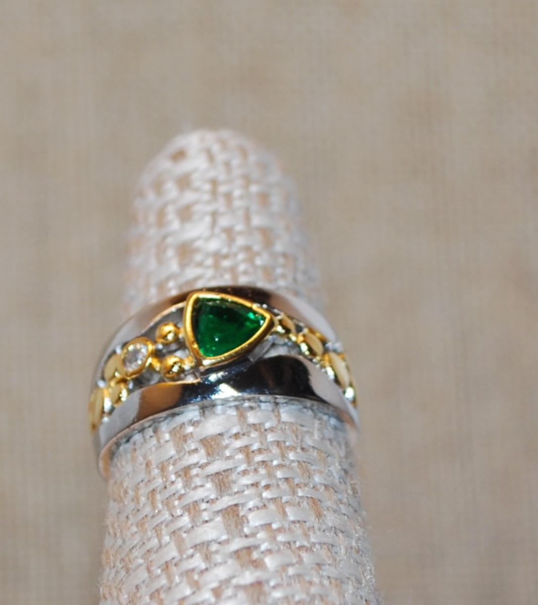 Size 7¼ Marked .925 Green Trillion Cut Main Stone Ring with 2 Tone Accent on a Silver Band (4.2g)
