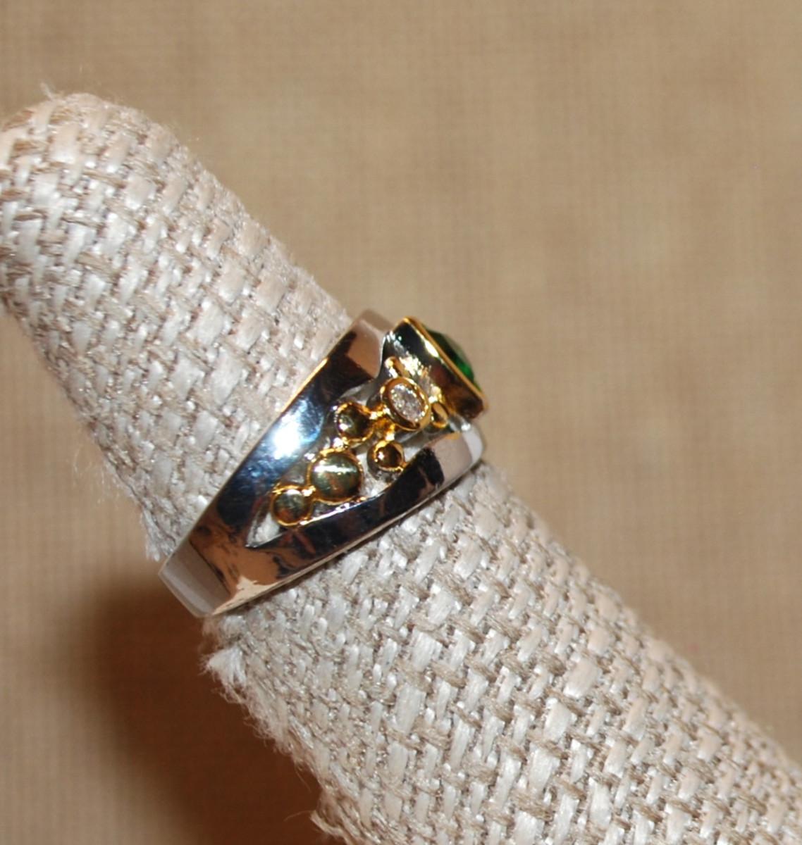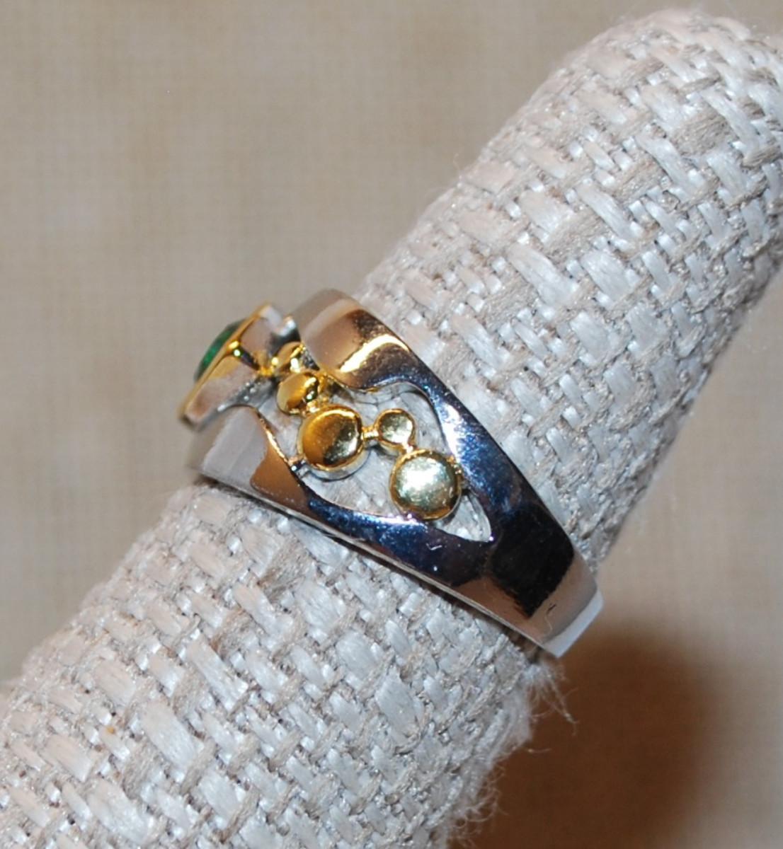 Size 7¼ Marked .925 Green Trillion Cut Main Stone Ring with 2 Tone Accent on a Silver Band (4.2g)