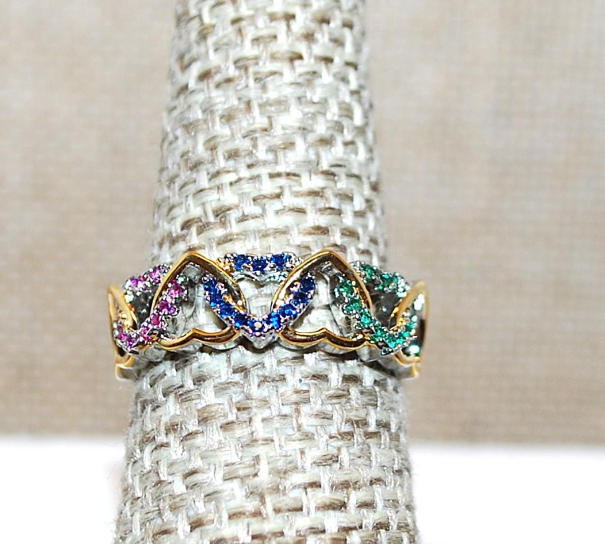 Size 7 Marked .925 Interlocking 2-Tone HEARTS Rings in RED, BLUE & GREEN Stones on a Silver Band (2.7g)