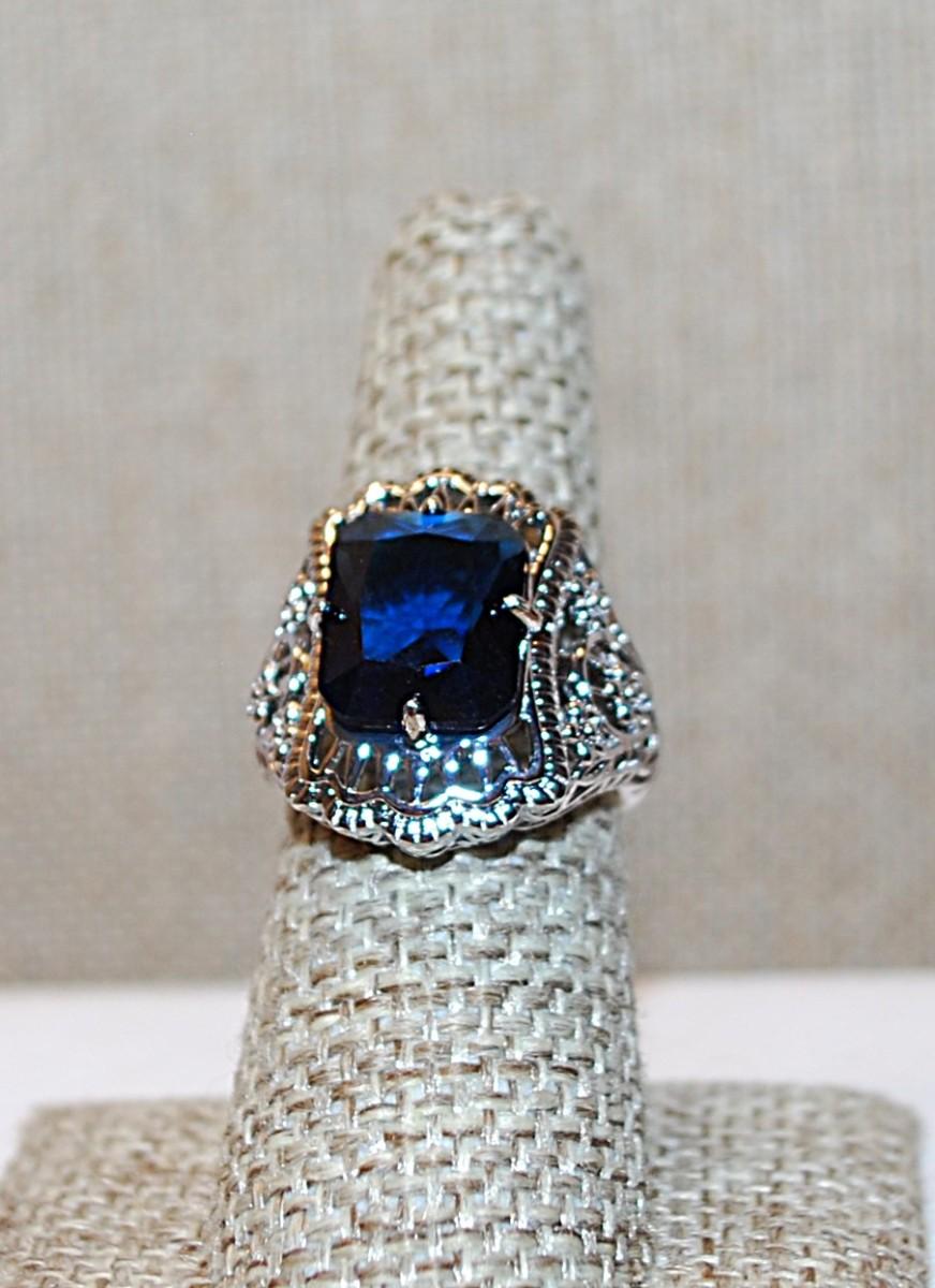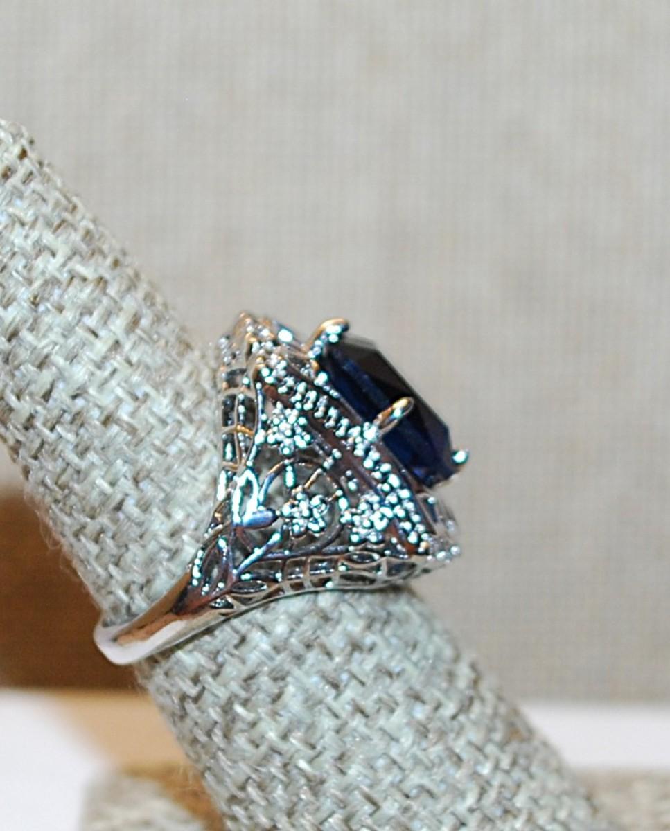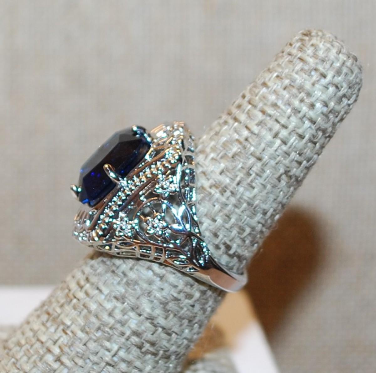 Size 7 Marked .925 Large DEEP BLUE Rectangle Stone Ring on a Silver Open-Grid Band (5.2g)