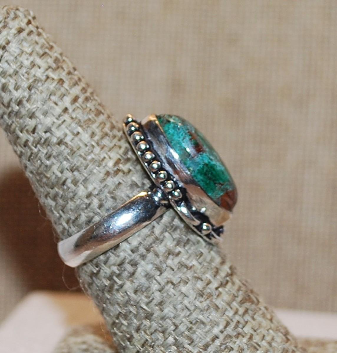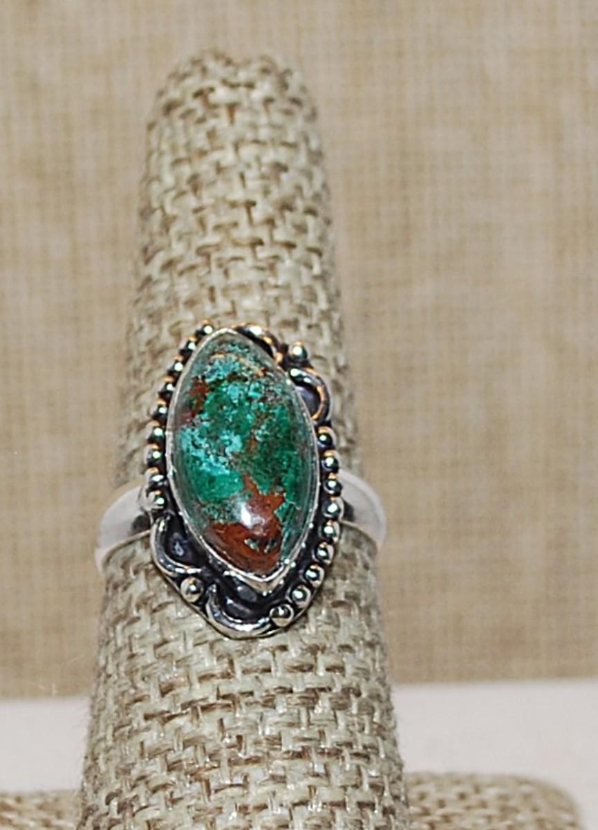 Size 7½ Marked .925 Marquise Cut REDS & GREENS AGATE Gemstone Ring with Decorative Full Surround on a Silver-Plated Band (5.7g)