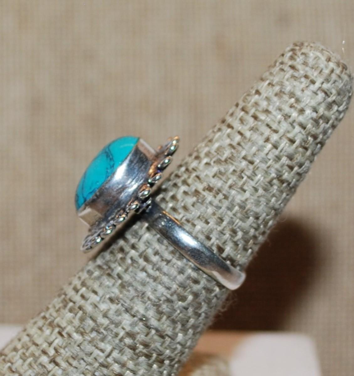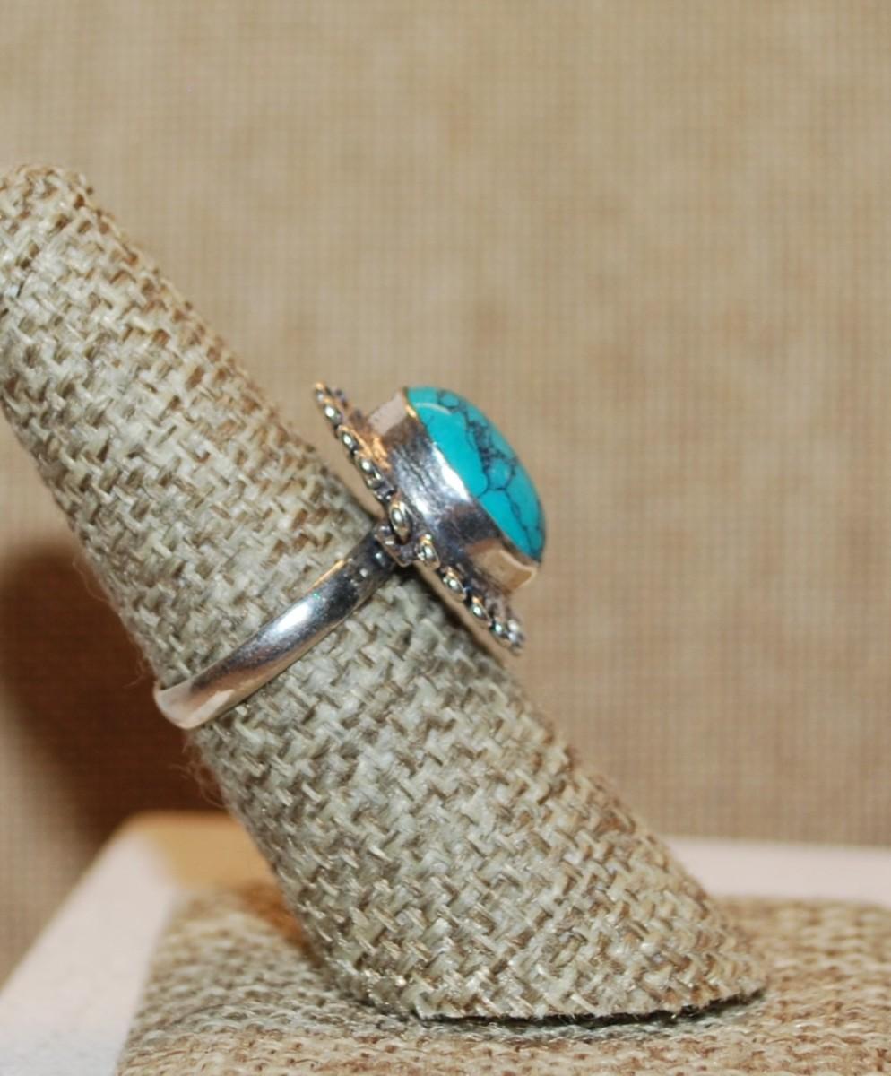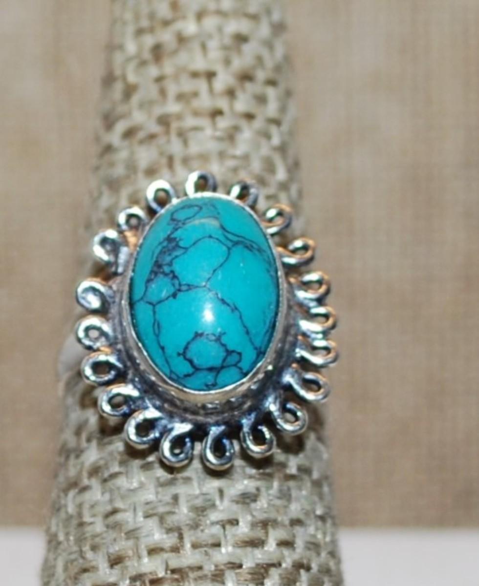Size 7 Marked .925 Oval Crackled Turquoise Gemstone Ring with Rope Style Surround on a Silver-Plated Band (3.7g)