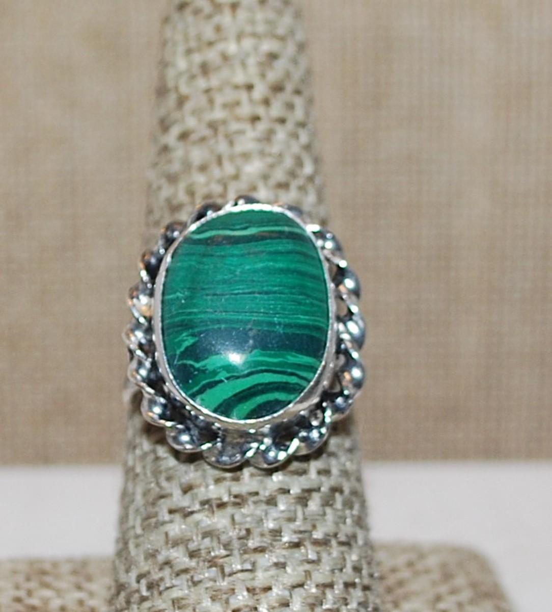 Size 7½ Marked .925 Oval GREENS & BLACK MALACHITE Gemstone Ring with Swirled Surround on a Silver-Plated Band (5.8g)