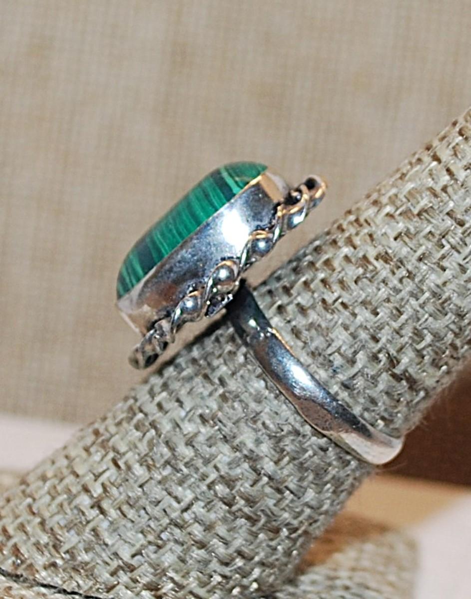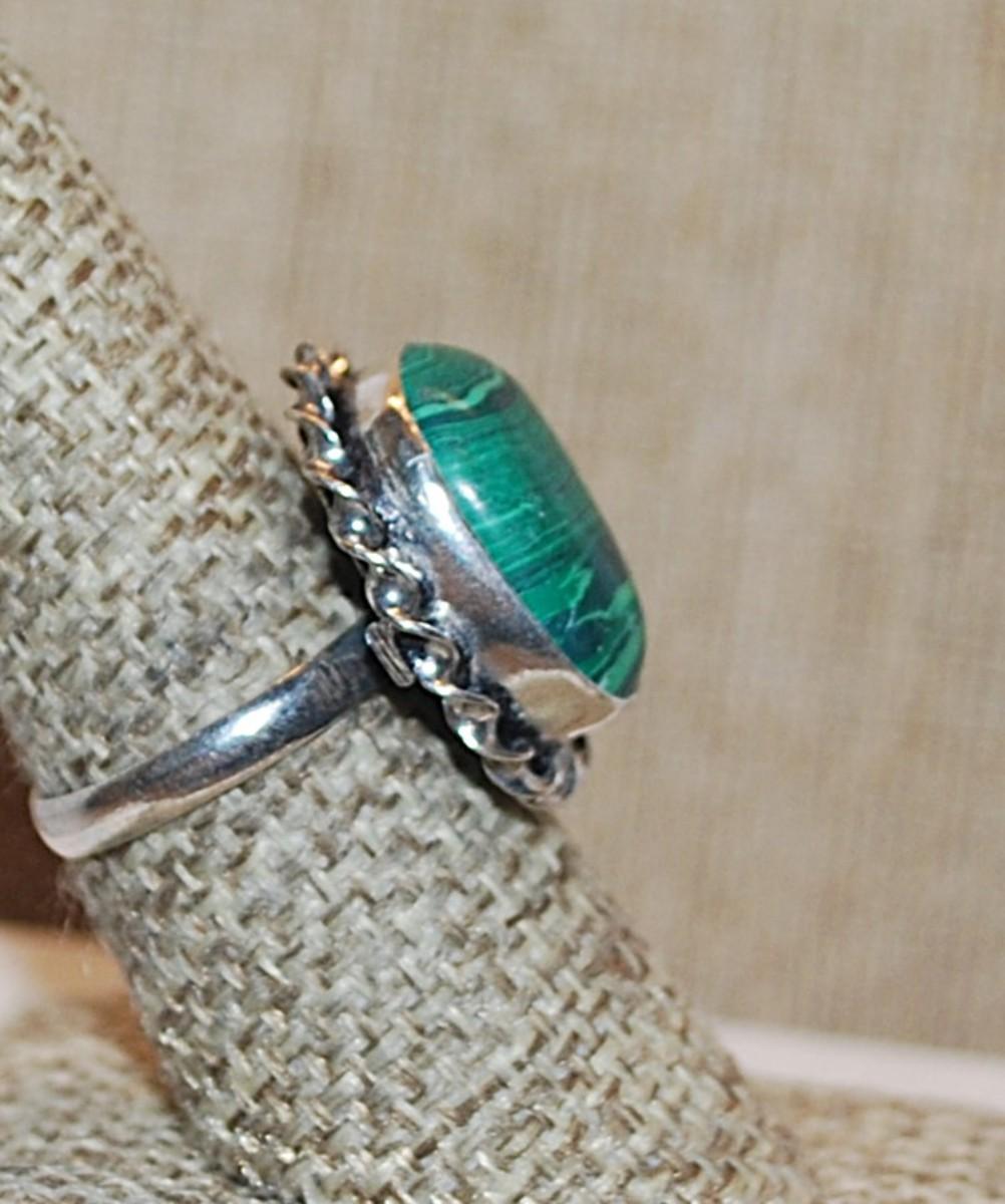 Size 7½ Marked .925 Oval GREENS & BLACK MALACHITE Gemstone Ring with Swirled Surround on a Silver-Plated Band (5.8g)