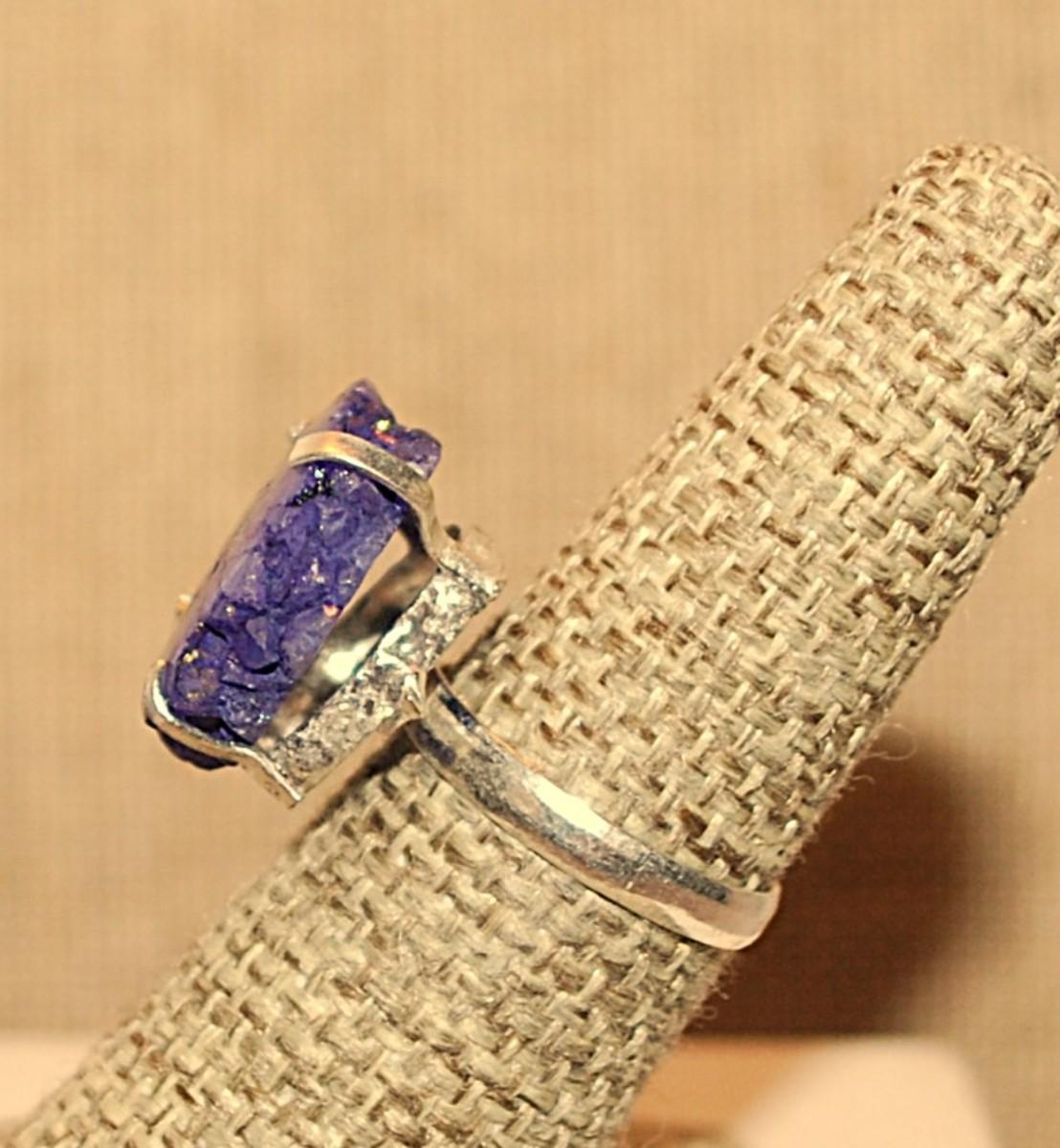 Size 7 Marked .925 PURPLE 4 Prong SOLAR QUARTZ DRUZY Gemstone Ring on a Silver-Plated Band (4.9g)