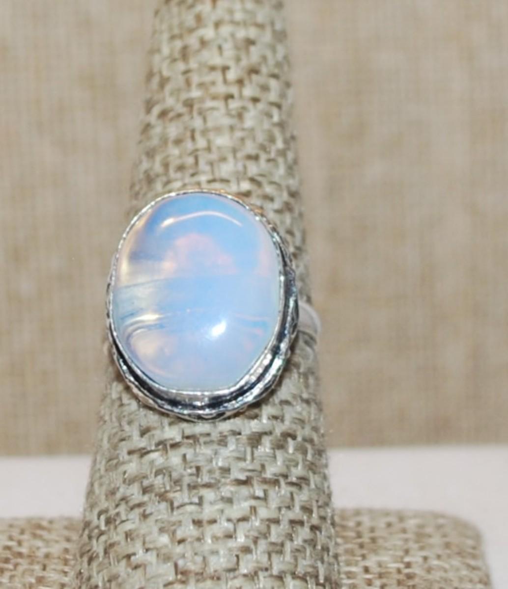 Size 7½ Marked .925 Translucent "Clouds" Light Blue OPAL Style Gemstone Ring on a Silver-Plated Band (5.7g)