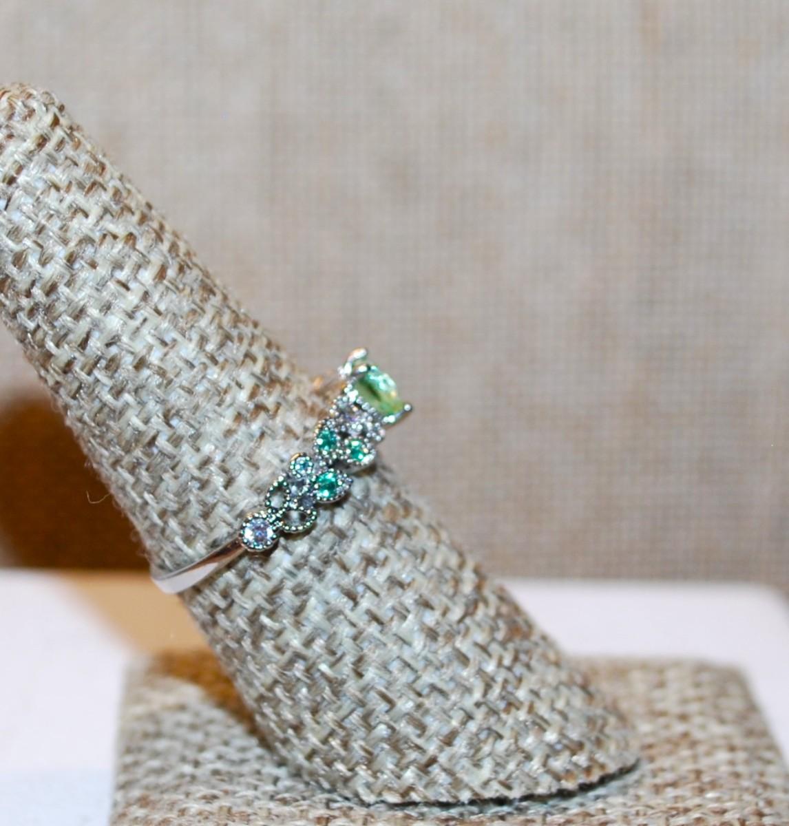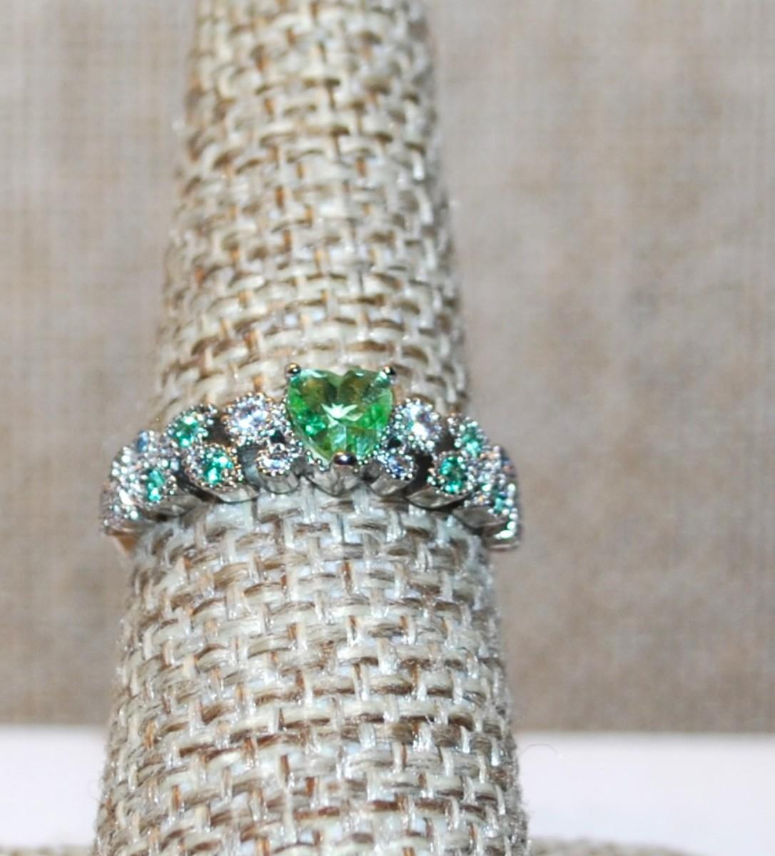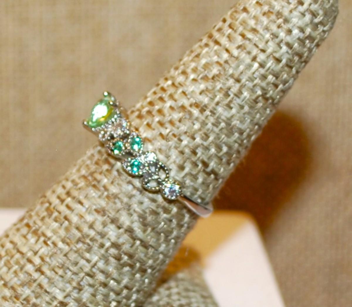 Size 7¼ Marked .925 Transparent Light Green HEART Stone Ring with Green "Leaf" Side Accents on a Silver Tone Band (2.1g)