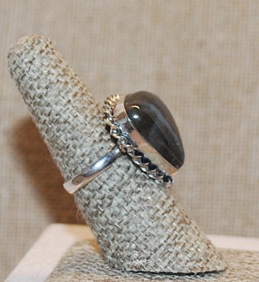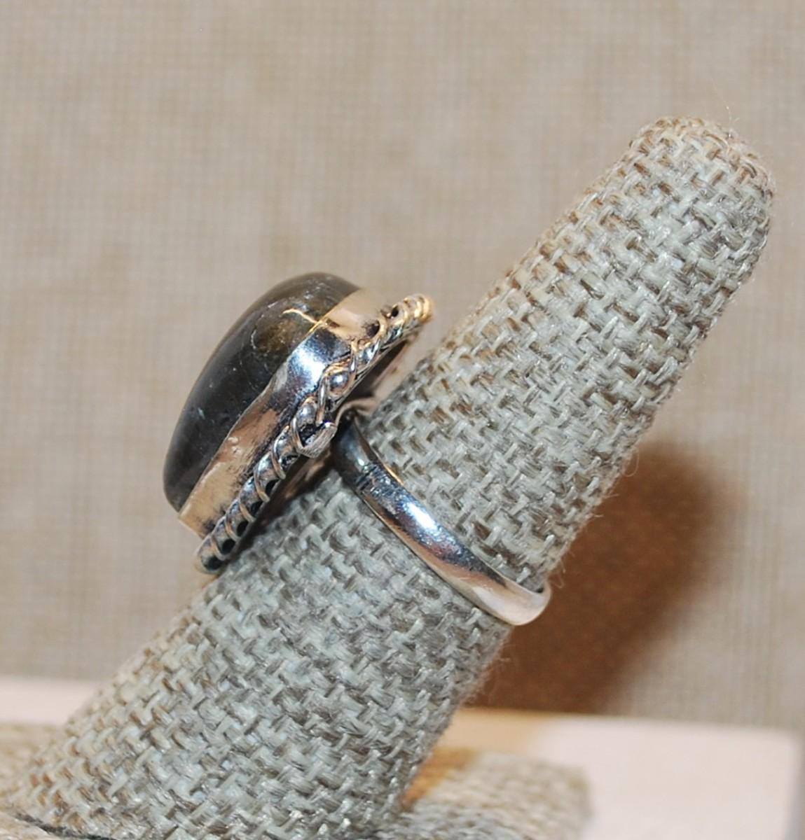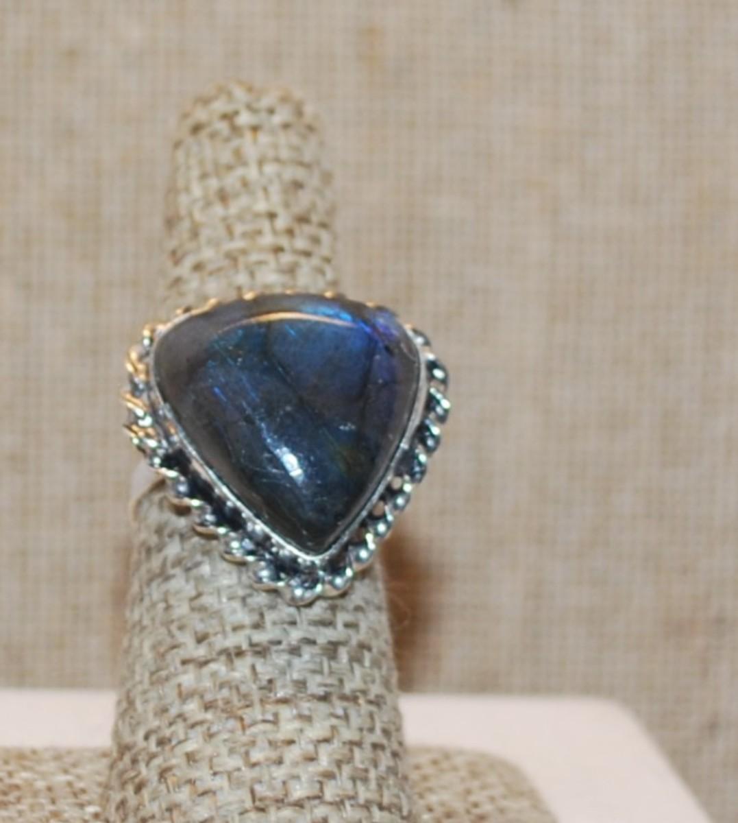 Size 7 Marked .925 Triangle Shape IRIDESCENT BLUES AGATE Gemstone Ring with Silver-Plated Band (8.4g)