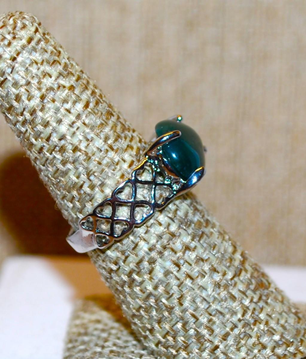 Size 7 Moss Green Agate Ring with Criss-Cross Side Accents on a Silver Tone Band (3.3g)