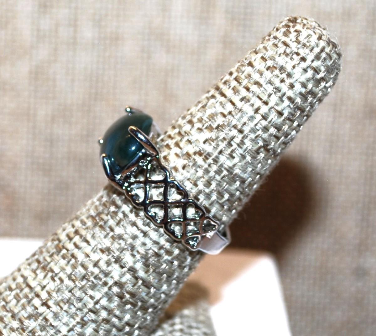Size 7 Moss Green Agate Ring with Criss-Cross Side Accents on a Silver Tone Band (3.3g)