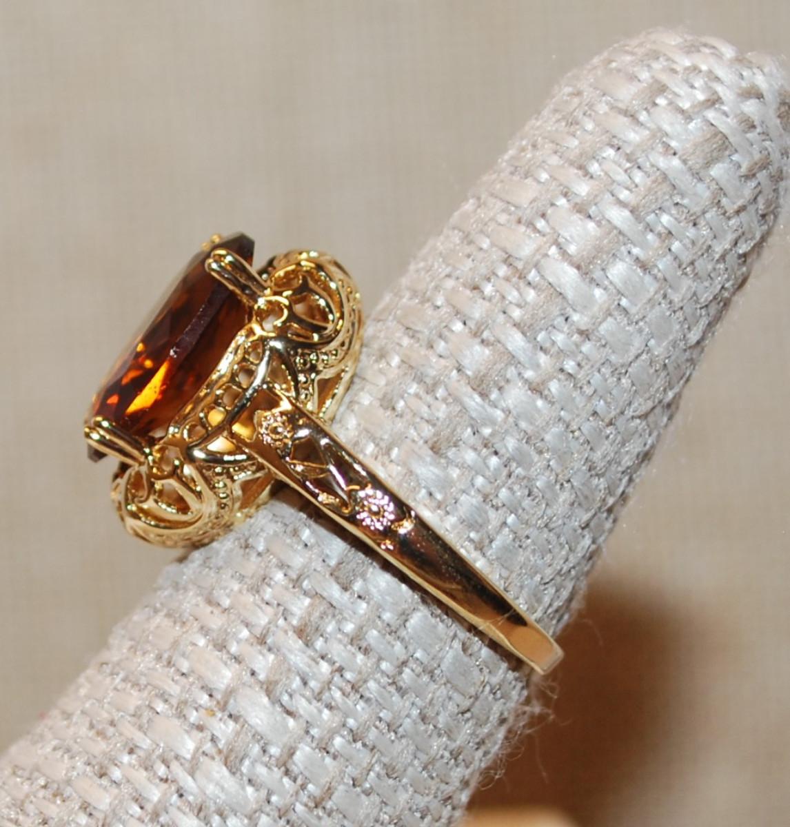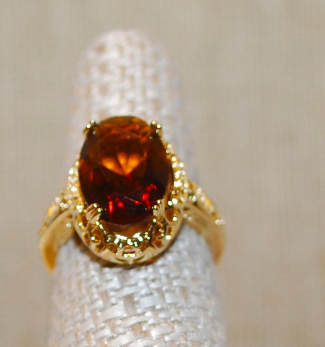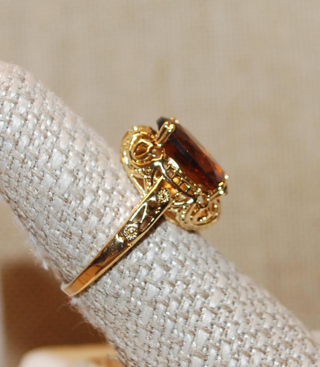 Size 7½ Oval Brown & Amber Stone Ring on a 4 Prong Nest Setting with a Gold Tone Band (4.2g)
