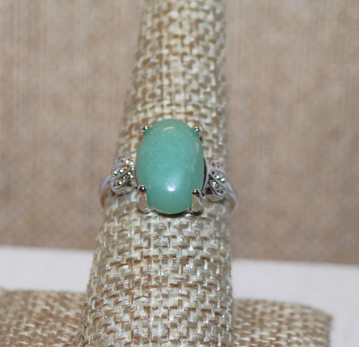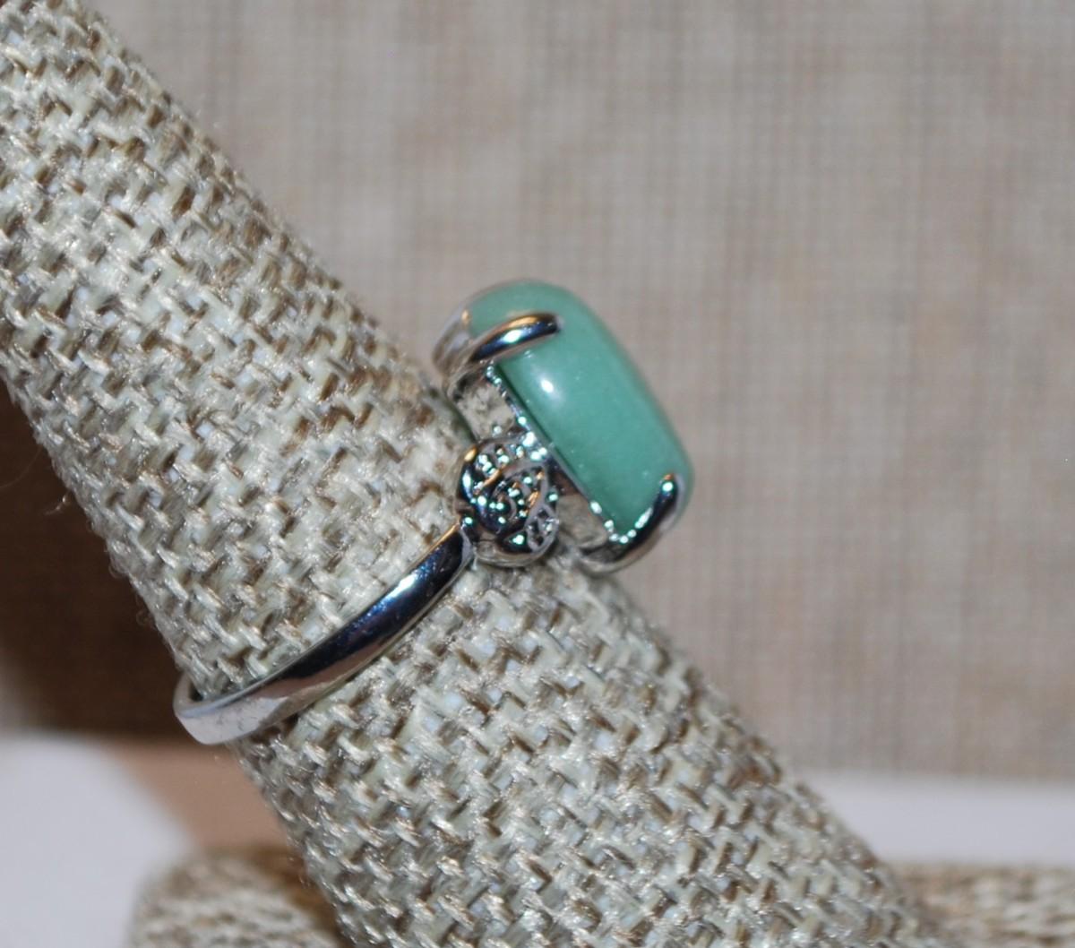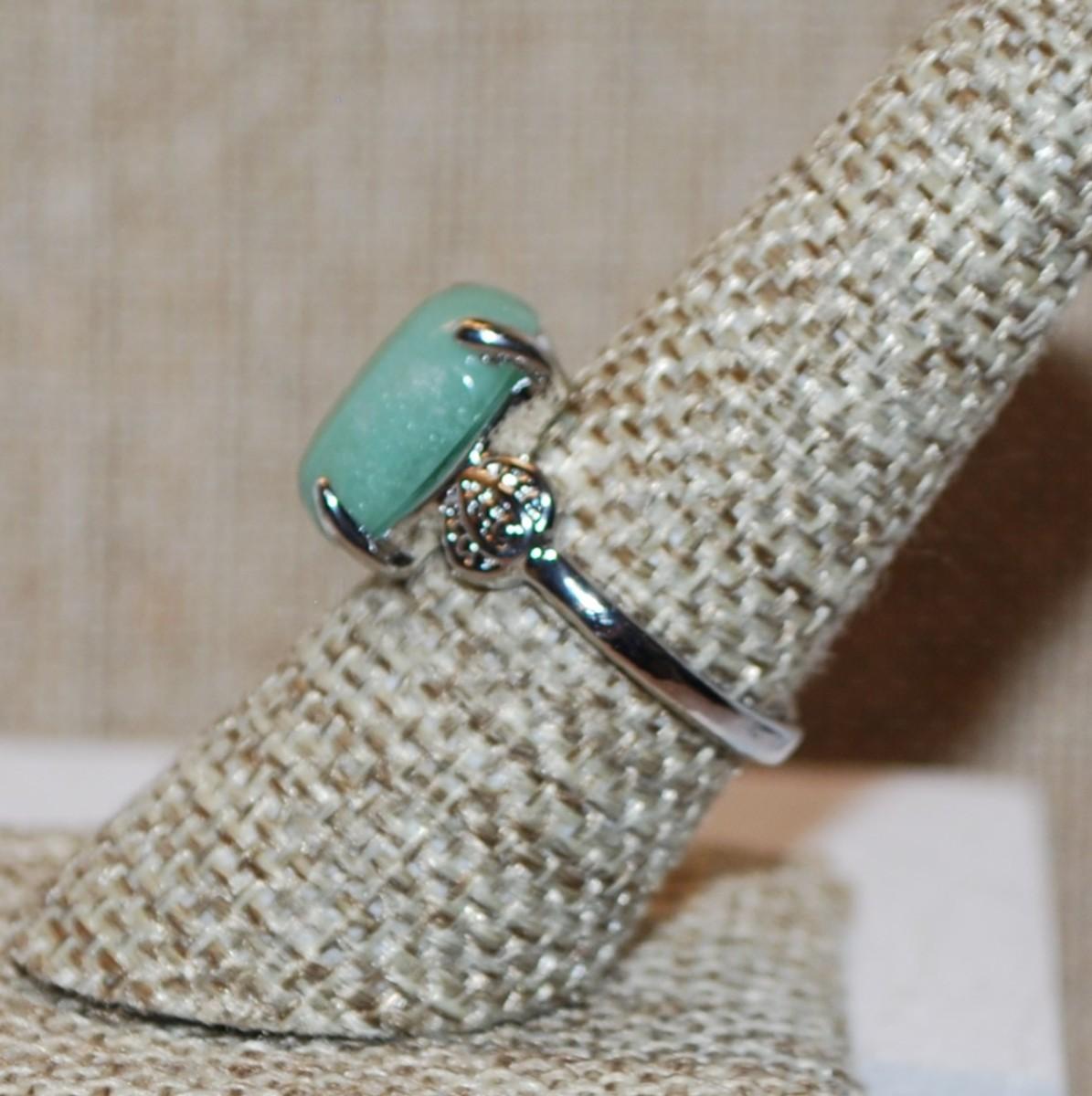 Size 7½ Oval Green Aventurine Stone Ring with Side Single Spheres on a Silver Tone Band (3.8g)