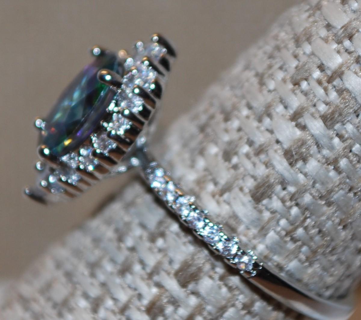 Size 7 Oval Green & Blue Iridescent Ring on a Clear Stones Surrounds on a Silver Tone Band (3.1g)