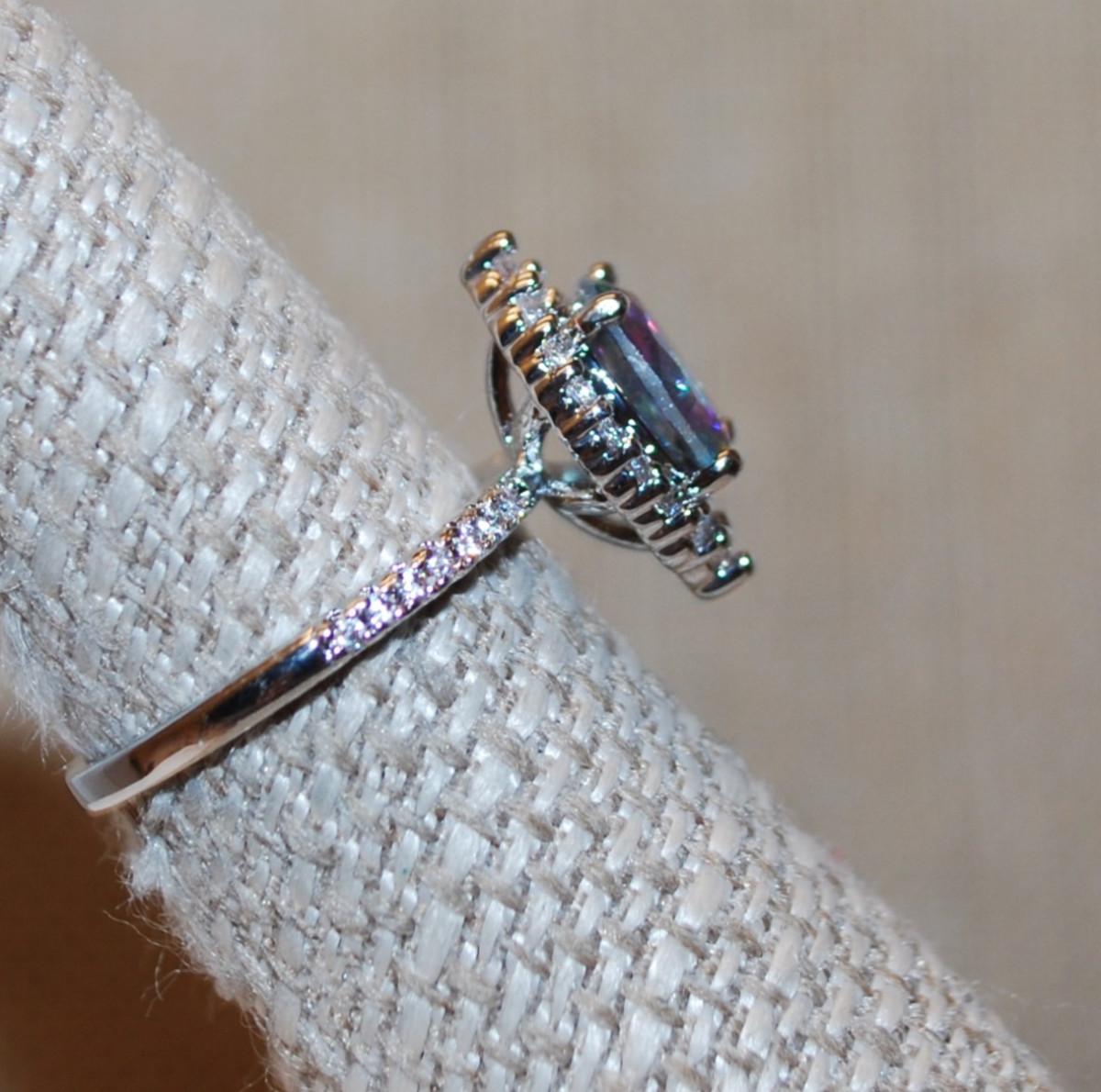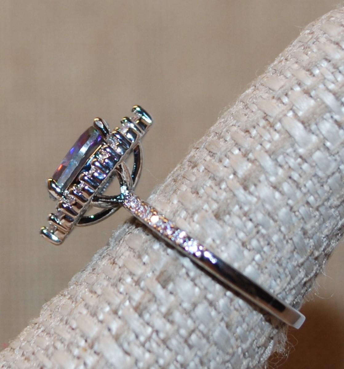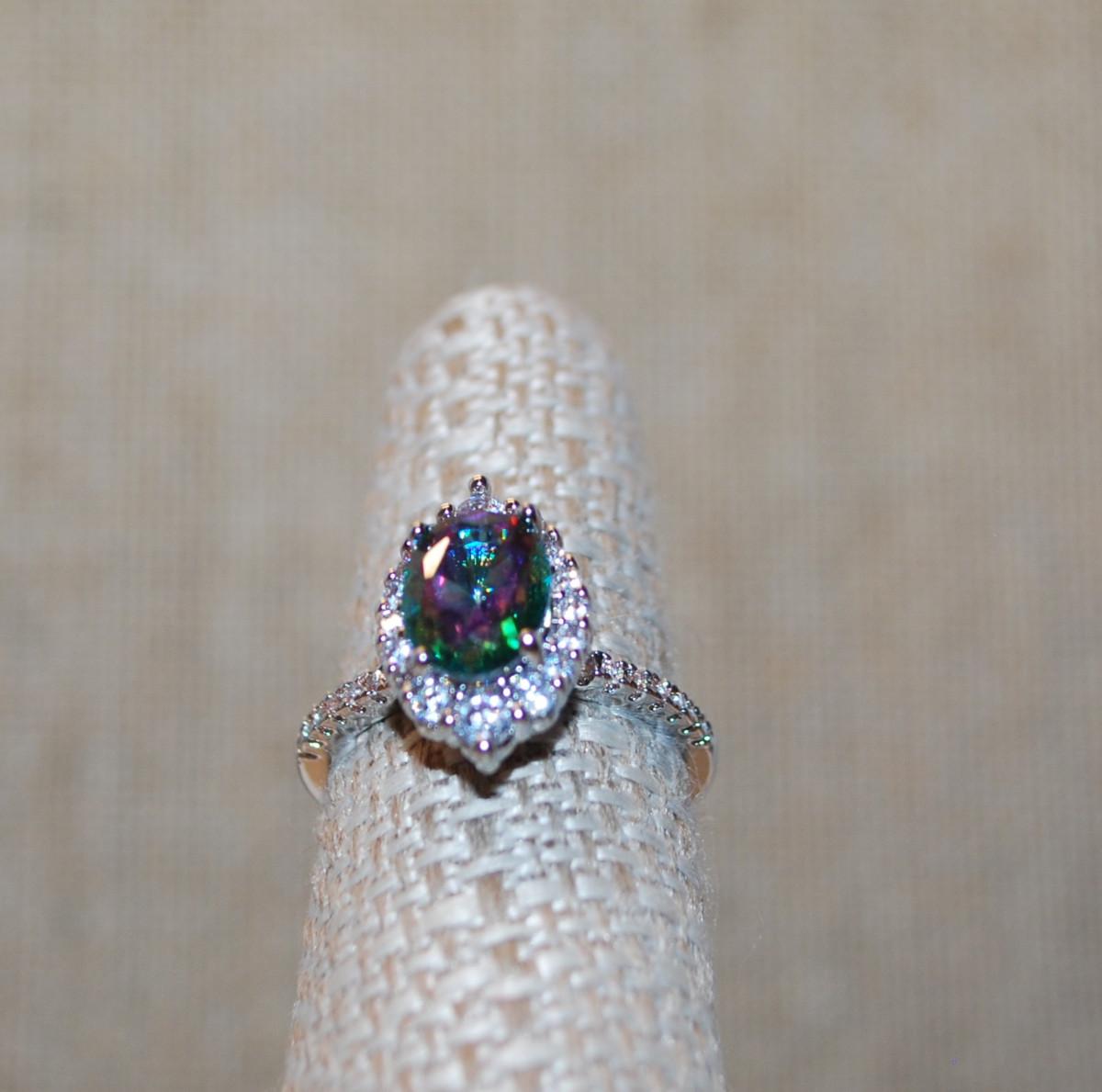 Size 7¼ Oval Iridescent Main Stone Ring with Marquise Style Accent Setting on a Silver Tone Band (3.5g)
