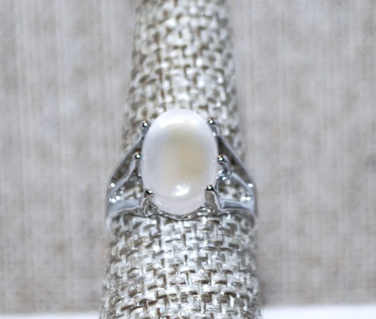 Size 7 Oval White Opal Stone Ring with 3 Line Side Accents on a Silver Tone Band (3.9g)