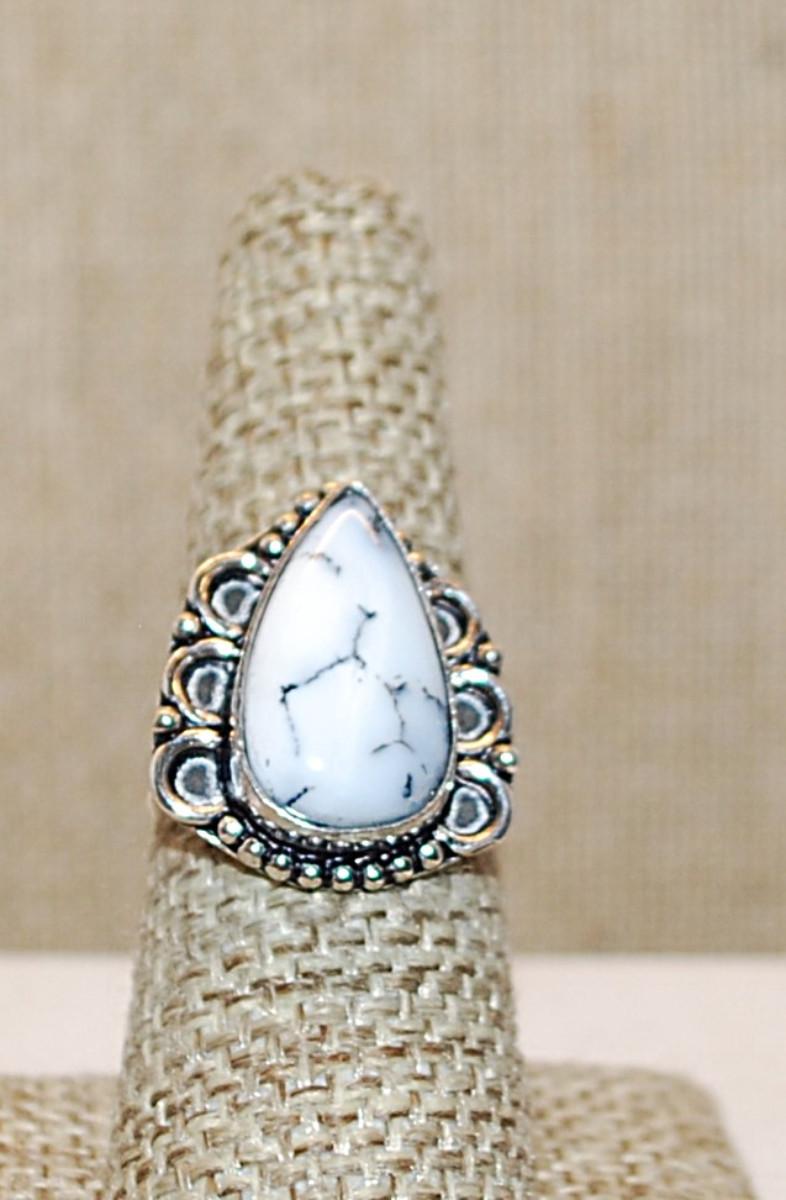 Size 7½ PEAR Shaped DENDRITE OPAL Gemstone Ring with a 6 Loop Surround on a Silver Tone Band (4.7g)