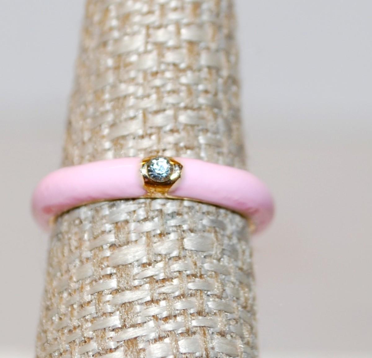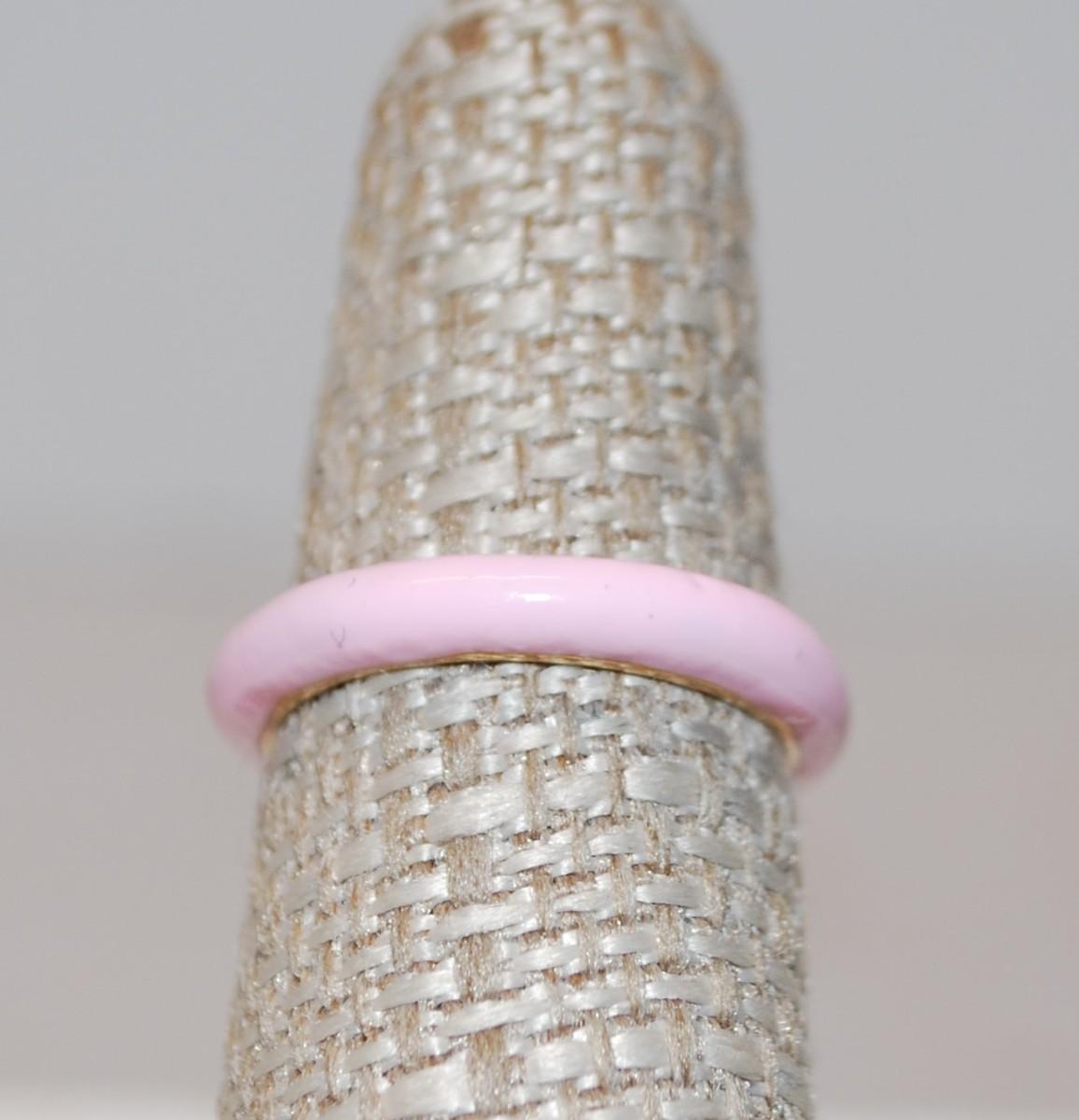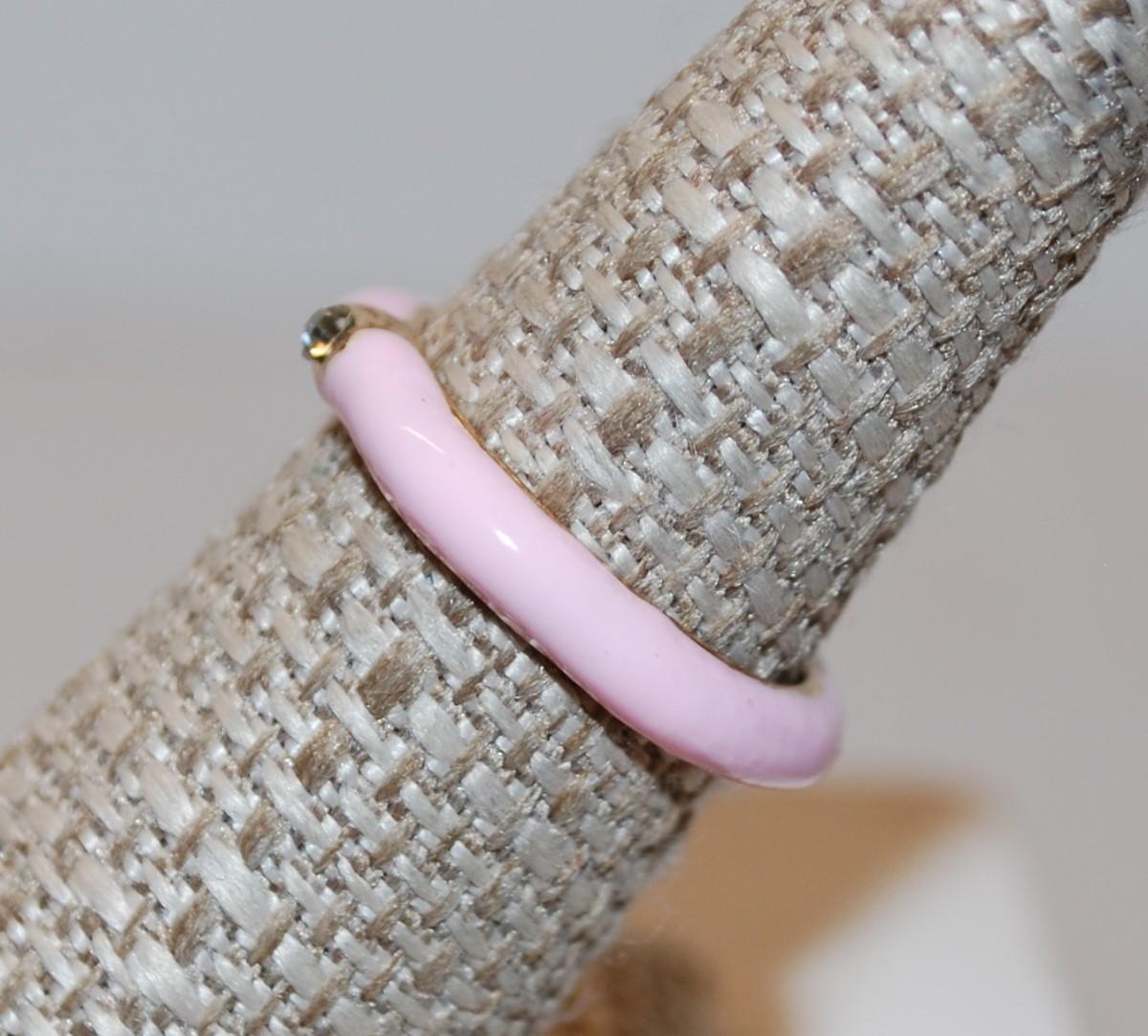 Size 7 Pink Enamel Band Ring with Gold-Circled Solitaire Clear Stone (2.9g)
