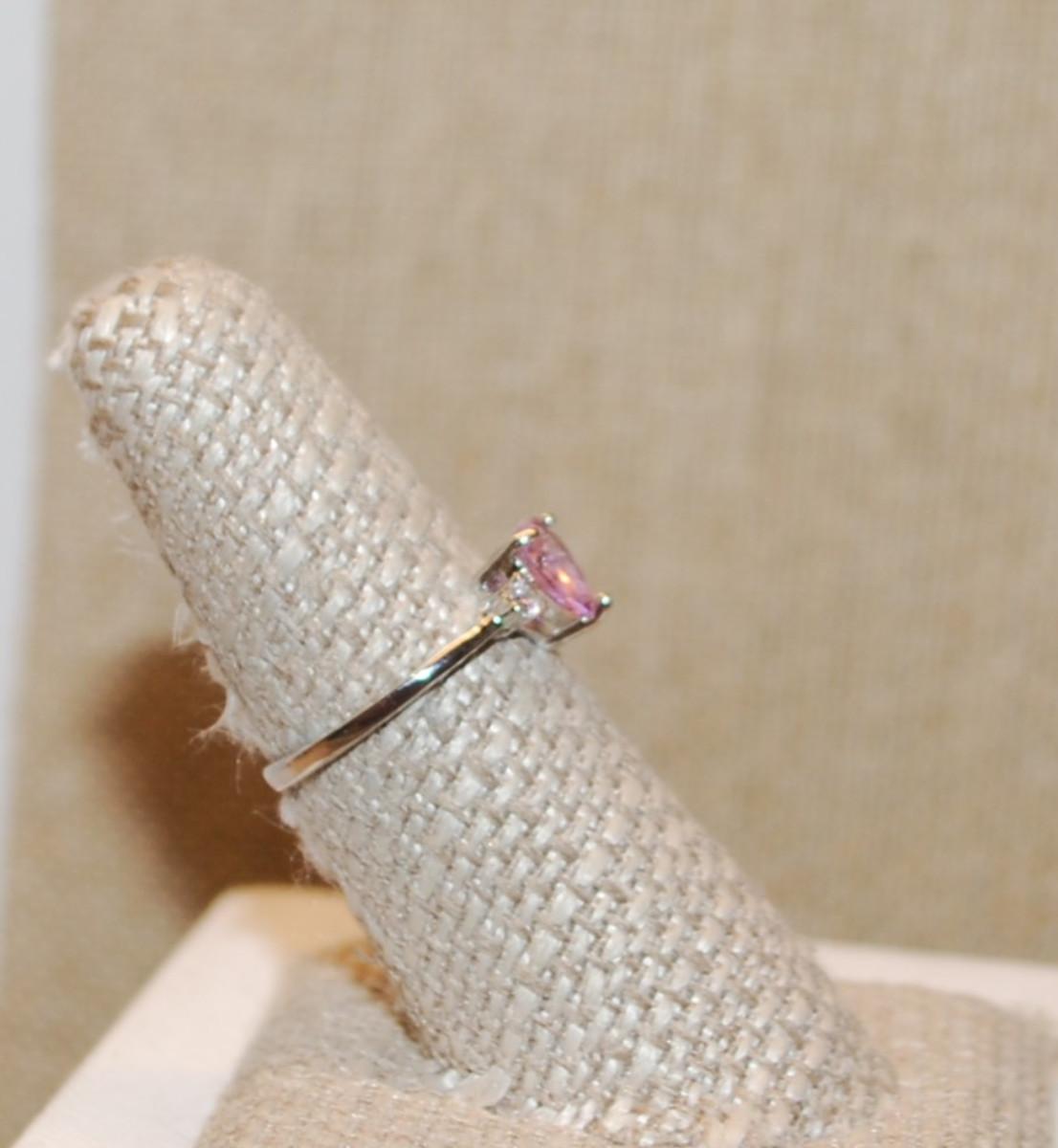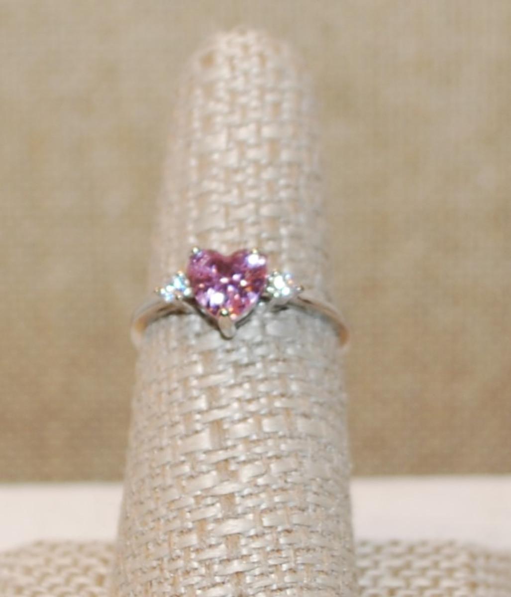 Size 7 PINK HEART 3 Prong Stone Ring with 2 Round Clear Stone Sides on a Silver Band (1.7g)