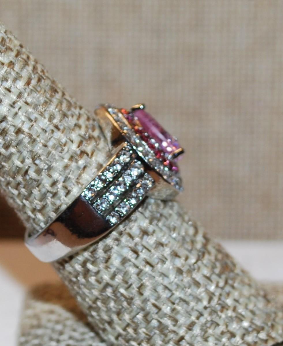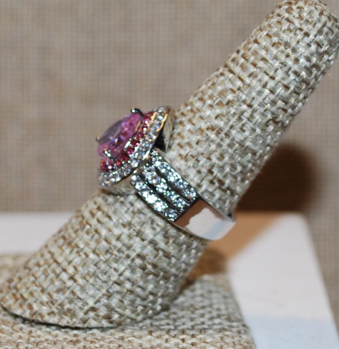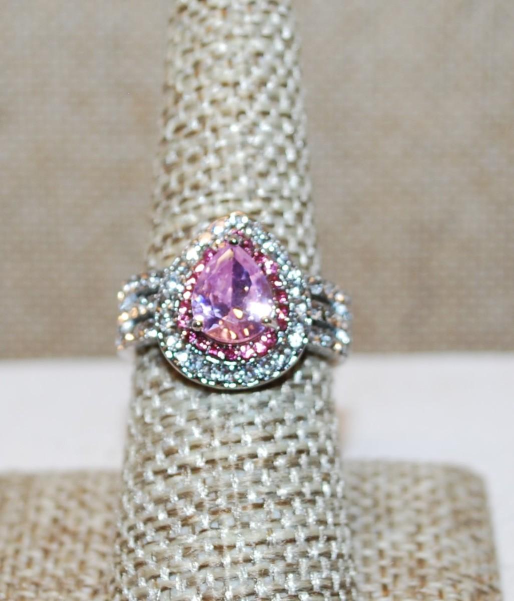 Size 7¾ Pink Pear Cut Center Stone Ring with Clear Stones Sides and Surrounds on a Silver Tone Band (5.7g)
