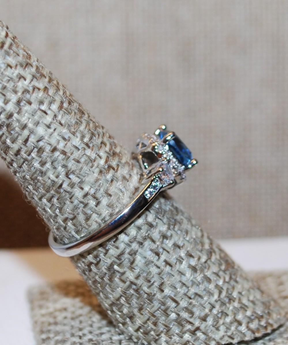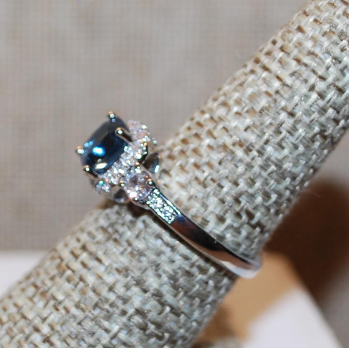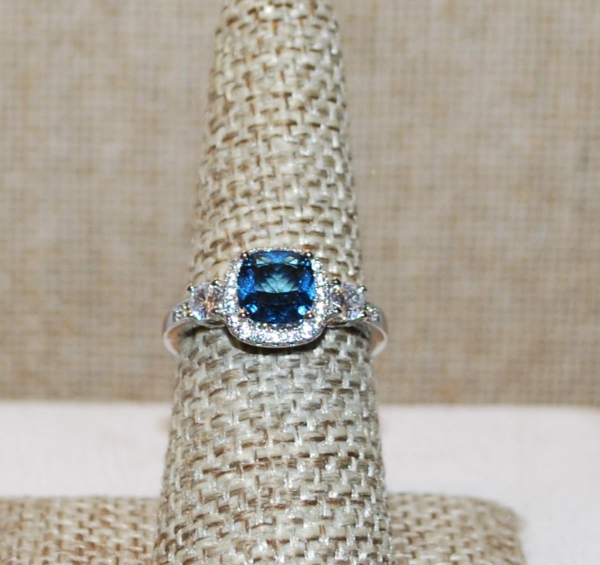 Size 7 Pretty Asscher Cut Blue Stone Ring with Full Surrounds on a Silver Tone Band (2.9g)