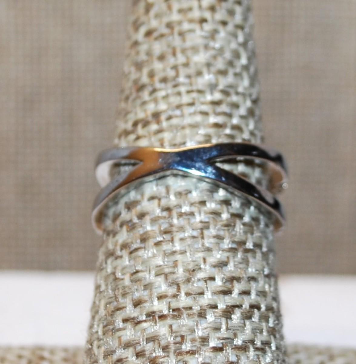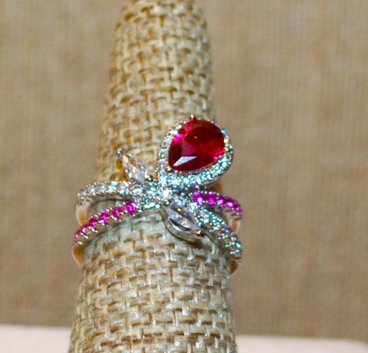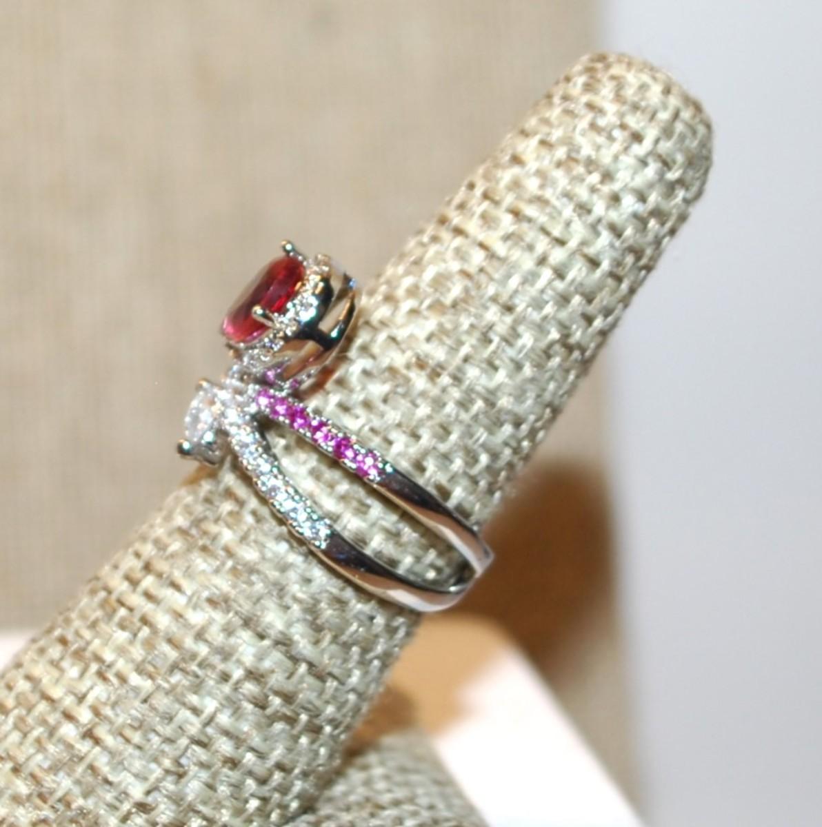 Size 7 Pretty Bowtie Style Ring with a Red Pear Cut Main Stone and Pink/Clear "Ribbons" on a Silver Tone Band (4.4g)